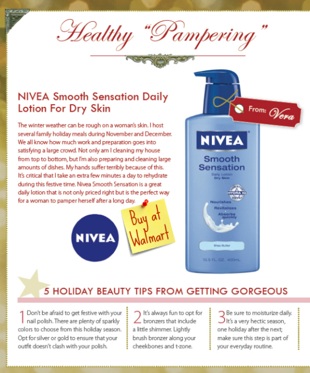 I came across Nivea lotion in the gift guide and thought about how it would work for both stocking stuffers and could be part of a teacher’s gift. I thought about putting together a basket full of relaxing gifts for the teachers with a little note on the lotion that said, “Thanks for making my preschool experience a ‘smooth’ ride”. Sinisa thought it was pretty corny so I’ll have to keep thinking about the saying but I headed to Walmart to pick up some lotion in the meantime.
