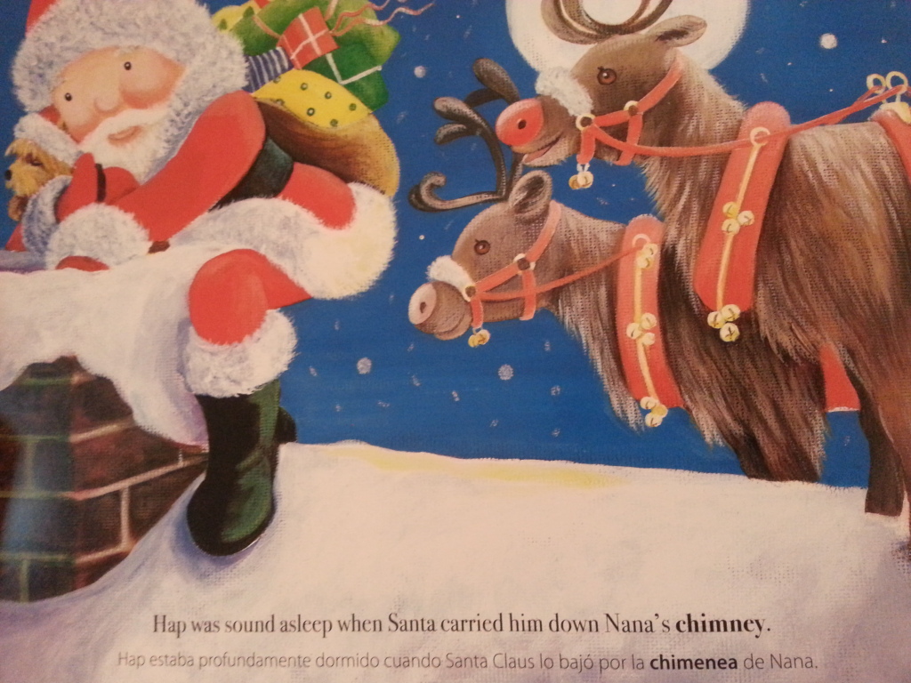 Available in Hardcover English or in the Soft Cover bilingual version of English/Spanish. This bilingual version appears to be unique as the two languages are next to each other and highlighted words help the reader to learn words of the second language. The book is landscape 8″x 10″ and 40 pages of good life lessons, goodwill, hope and fun. Just what is needed at Christmas time.