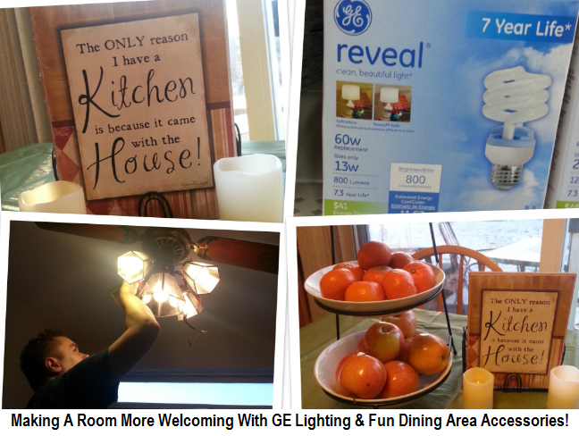 My family and I live in a duplex and have a small dining area that basically consists of a couple cabinets and a rectangular shaped table and chairs set. I had never really thought about decorating the dining area since I have young kids, including a 3 year old who can make a mess out of anything he is eating. Recently I had the chance to makeover my dining room area and GE Lighting sent me some coupons for light bulbs since no room is complete without light. (This is sponsored but all thoughts are my own, as they always are.)