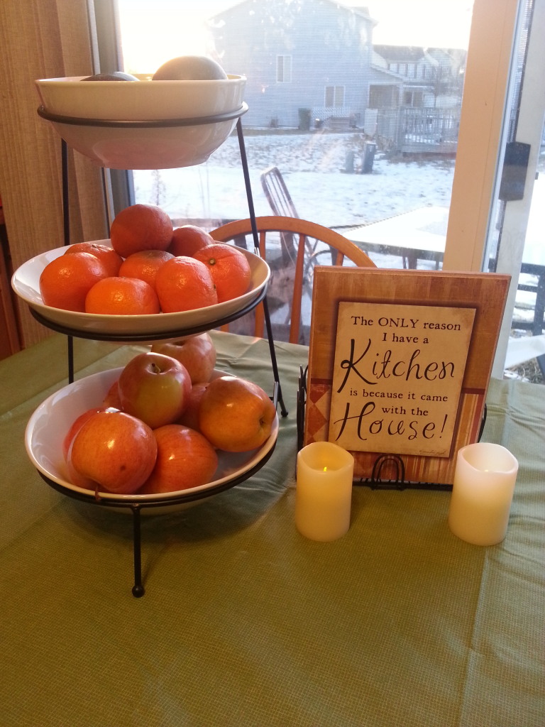 Along with the light bulbs I came home with a few things for the dining area including a tiered fruit stand. I have always wanted one and though the bowls are breakable I think it’s sturdy enough to withstand my family. I found a plaque that talked alluded to the fact that I don’t cook that often and some flameless candles (remember those little hands?). I also was thrilled to find some cute decorative jar carriers on clearance that people who can fruits and vegetables probably use that I thought would work to hold bowls of condiments, appetizers, and trifle dishes for dessert. The last thing I decided upon were some colorful tablecloths to add a splash of color to the room.