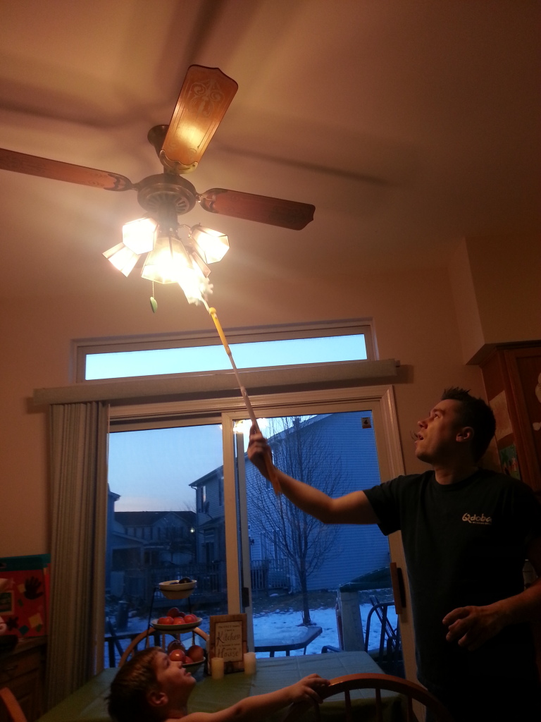 We had a mixture of energy efficient spiral bulbs and regular light bulbs. One of the bulbs had burnt out a few weeks back and we hadn’t gotten around to changing it. The fixture was also dusty so Sinisa cleaned it up a bit and added our new light bulbs. I’d really love to change the fixture but we rent so we are stuck looking at this one every day.