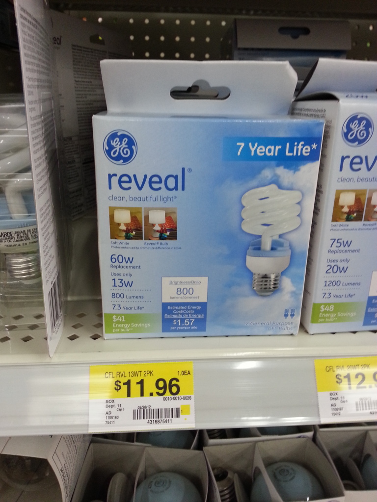 I also looked in the lighting area. There were shelves full of light bulbs. Honestly I normally just find cheap light bulbs and am out of the aisle in less than a minute but since I had coupons I actually looked at my options. GE had a great value back of light bulbs for a little over $8 but I chose to get the GE Reveal® light bulbs that came 2 for $12 because of the picture displayed on the front of the box. I liked the idea of having bright, beautiful lighting in my home as opposed to the lighting that is pictured on the left.