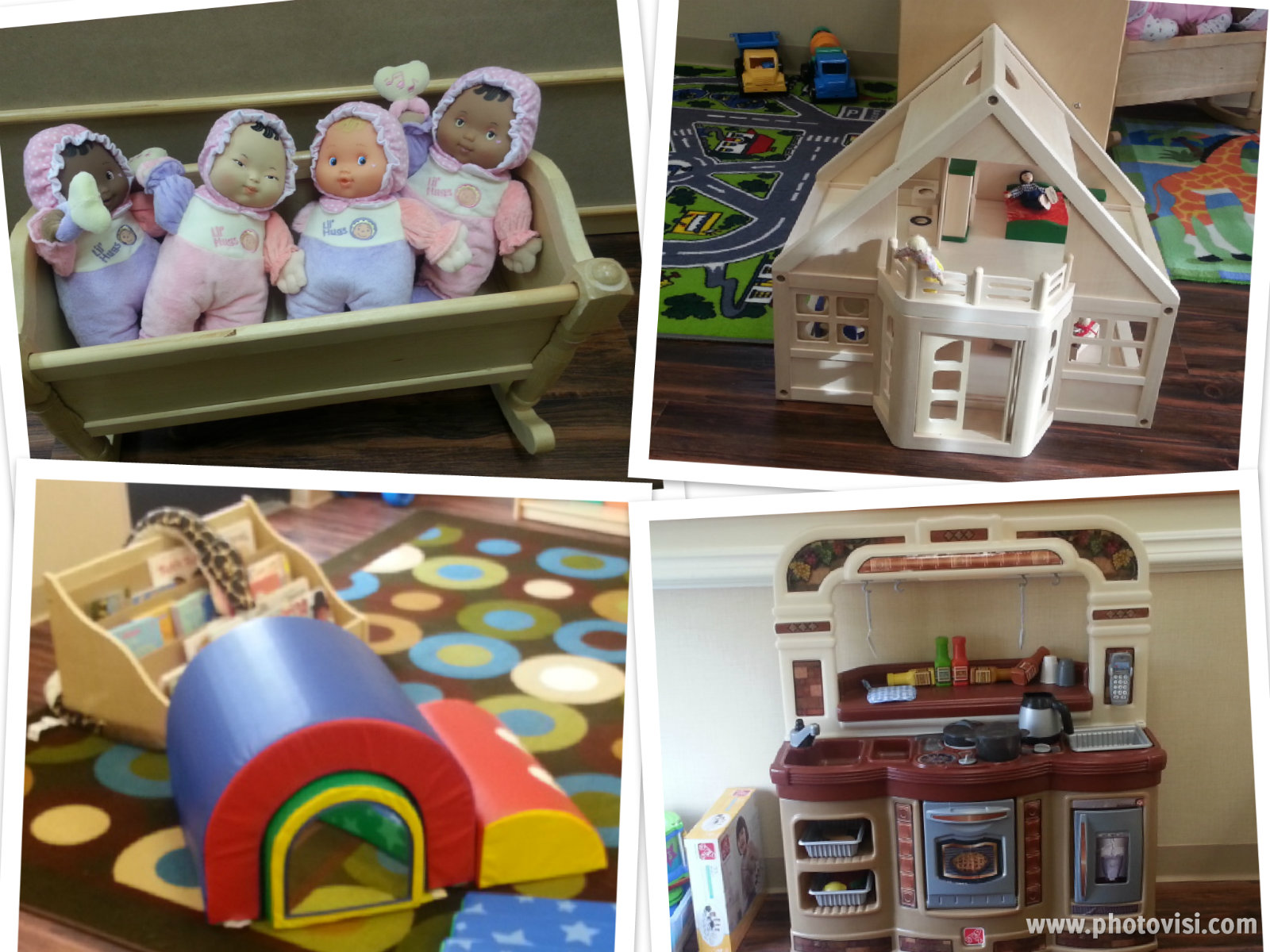 The home living area of the classroom was full of items that encouraged imagination as well. Each classroom had a kitchen area, some dress up clothes, and lots of other items that would help them pretend.