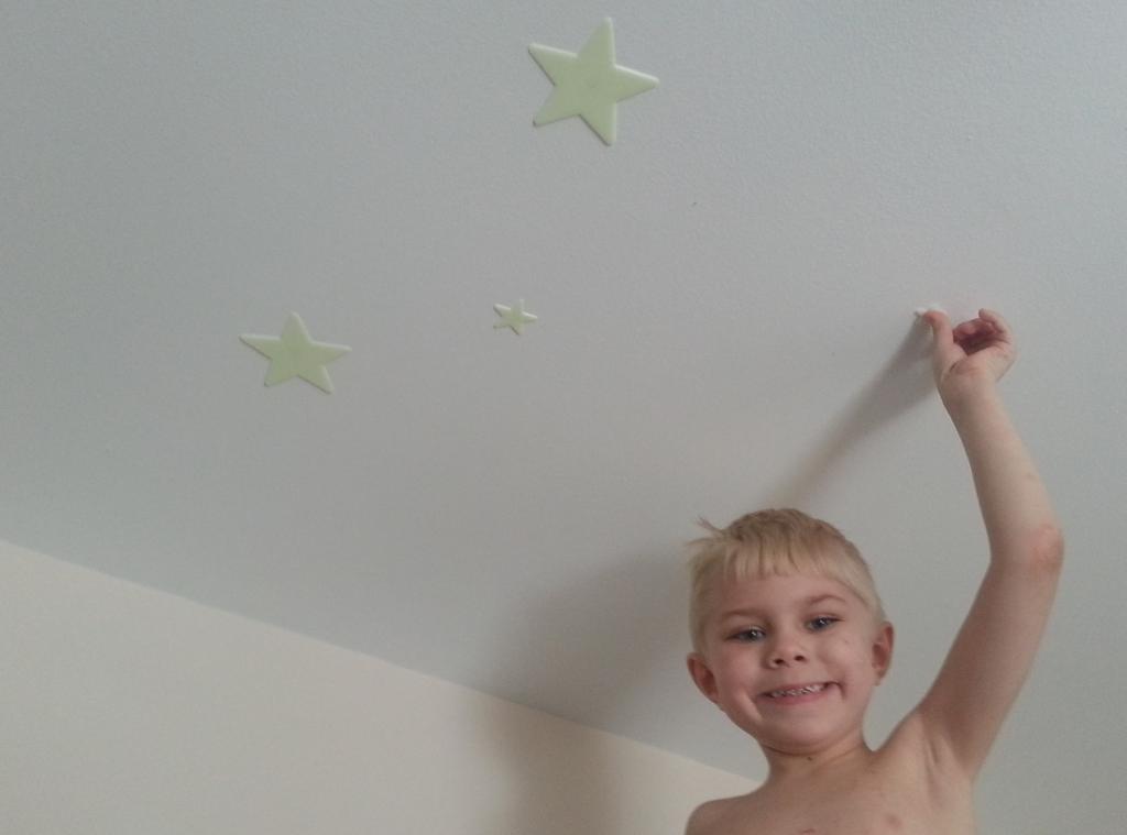 We bought Disney Specialty Paint by Glidden at Walmart. The paint is called “Ready, Set, Glow!”. It is a solar-powered, glow in the dark paint finish that can be used on top of a solid wall color to bring wall art to life in the dark. The glow in the dark paint finish only glows for 5 to 10 minutes or so at a time, so it won’t stretch out bedtime!