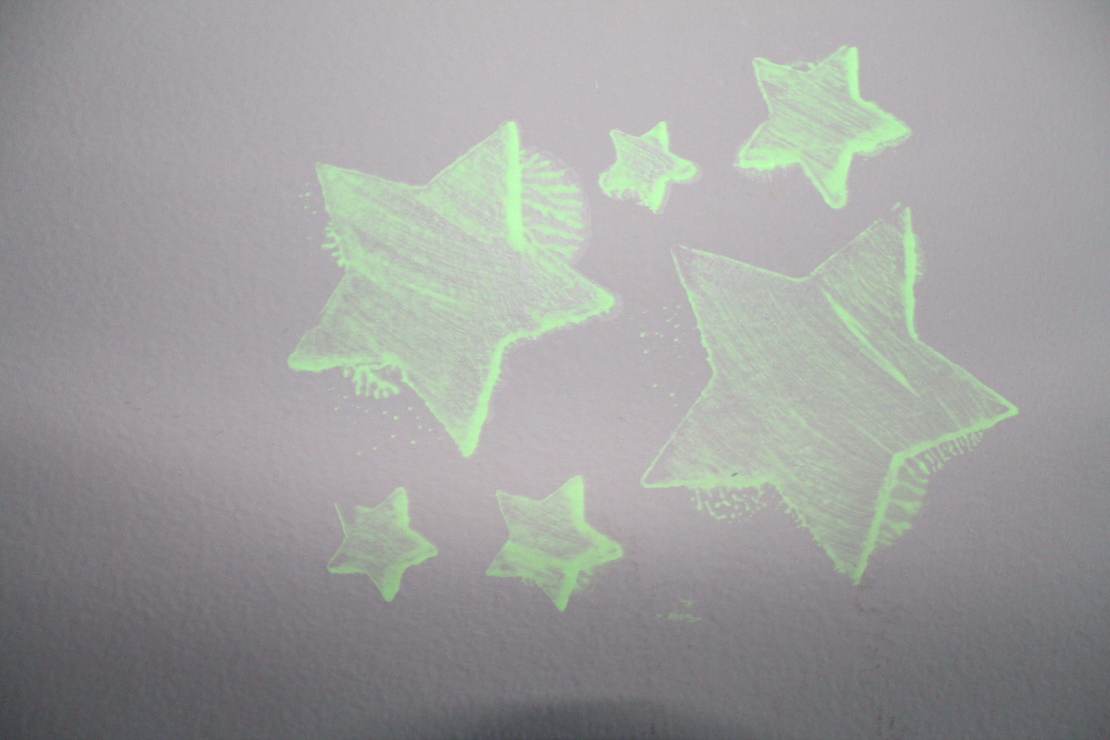 Of course checking out the walls in Jake and Luke’s room was a must. Since their walls are a light color the glow-in-the-dark paint was kind of camouflaged with the lights on (unless you looked closely) so it was a huge surprise when the lights were turned off. With the lights off, the designs on the walls along with the stars on the ceiling glowed.