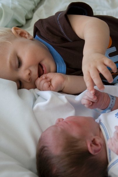 This picture is full of brotherly love. Big brother is playing while little brother is trying to sleep which is funny because that is still the situation today at the ages of 5 and 4.