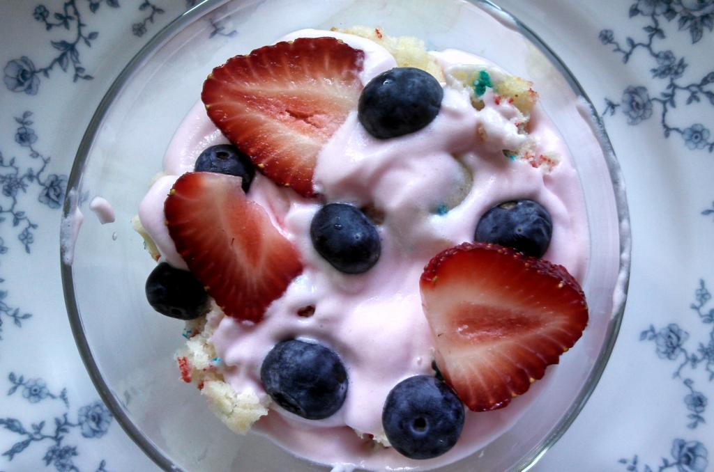 Sinisa made a topping for the pound cake instead of using frosting. He mixed cool whip and strawberry syrup together to make it. We then added strawberries and blueberries for a fun summer treat.