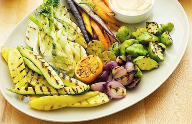 Preheat the grill for vegetables. Cut all the vegetables in half lengthwise, rub all sides sparingly with olive oil and sprinkle with salt and black pepper. Grill the vegetables on both sides for about 8 minutes if the pieces are large. Transfer to a serving dish.