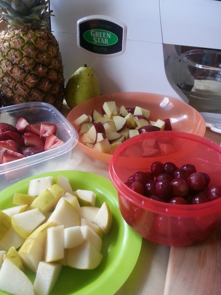 Sinisa went to the store and came back with a variety of fruits. We had grapes, apples, pears, strawberries, raspberries, watermelon, and a pineapple. The juicer came with some recipes but we decided to make our own mixed fruit juice. Sinisa chopped all the fruit up into small pieces.