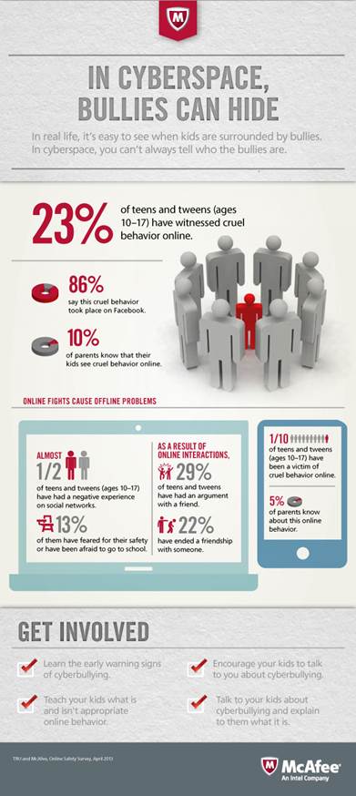 According to McAfee’s 2013 Digital Deception: Exploring the Online Disconnect between Parents and Kids study, children are witnessing bullying online in great numbers and parents are not fully aware of the issues. These findings show that there is an opportunity for parents to get more involved and better ensure that their children live safe online during the school years.