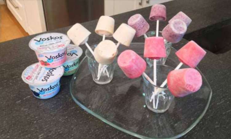 Banana Greek Pops: 2 bananas cubed 1 cup VOSKOSĀ® Vanilla Greek yogurt 2 tbs. sugar