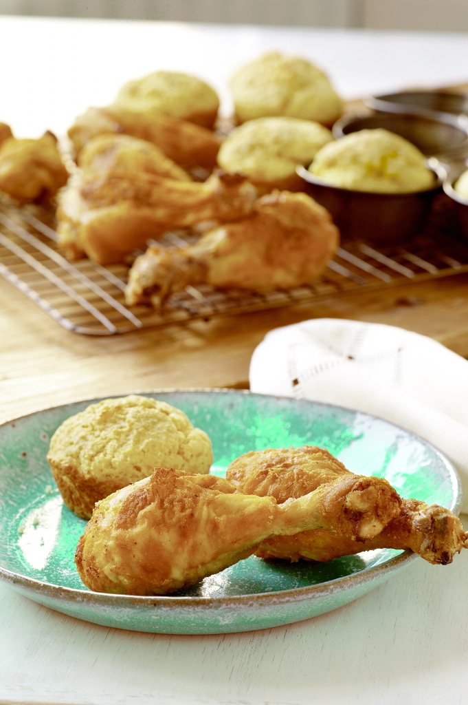 This “fried” chicken has been rehabbed by coating the chicken in flour and spices before baking it in the oven. The secret to creating the perfect skin is to place the coated legs in the refrigerator so that they dry out a little before baking—the skin crisps up in the oven once the moisture has evaporated from its surface. This recipe is perfect for a family friendly dinner.