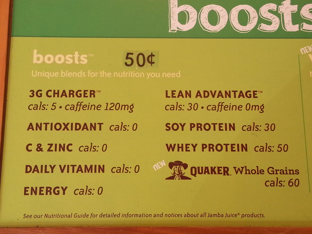 About a month ago I shared how Quaker fuels my family and is a great way to start the day. I recently learned that Jamba Juice now offers Quaker-branded whole grain boosts in their smoothies so people who drink their smoothies can get a boost of whole grains throughout the day. One Quaker-boost in a delicious, whole fruit smoothie offers one full serving of whole grains and only costs an extra 50 cents. I was intrigued so I headed to Jamba Juice today to try one with a gift card that Jamba Juice sent me.
