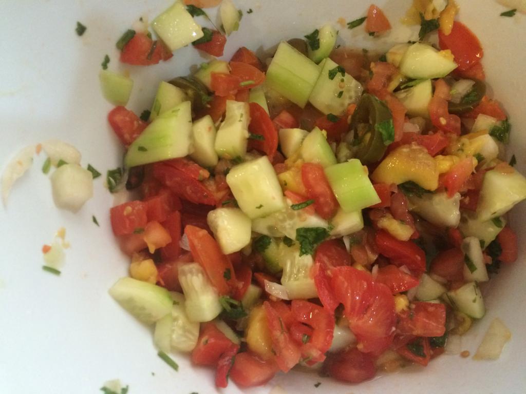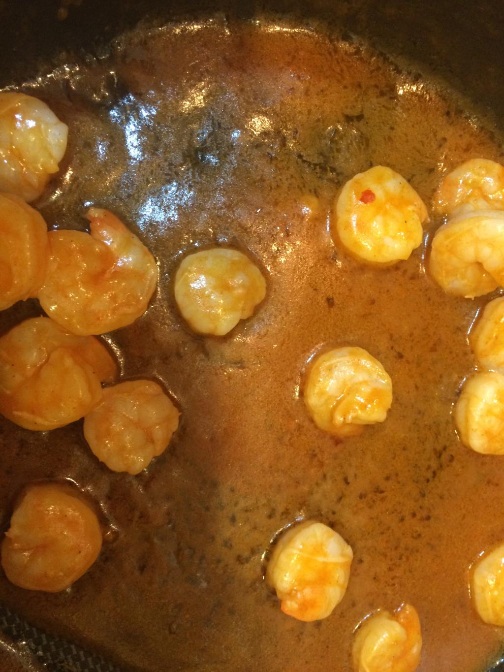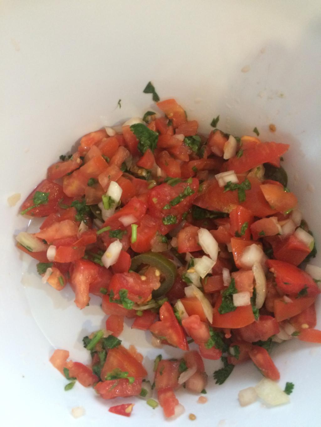 While the salsa is being chilled, the shrimp can be prepared. Lightly heat up a teaspoon of olive oil and toss the shrimp in a skillet. Season to taste with either a fajita seasoning or a hot sauce. There is no wrong choice. I chose to make today’s meal not spicy.