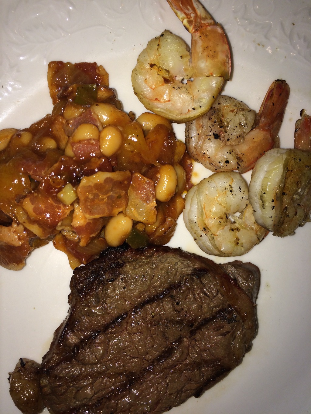 While the beans are baking you can go ahead and make anything you wish to use as the main entree. I chose to grill up some steak and shrimp because it was a nice day and fresh grilled meat sounded fantastic.