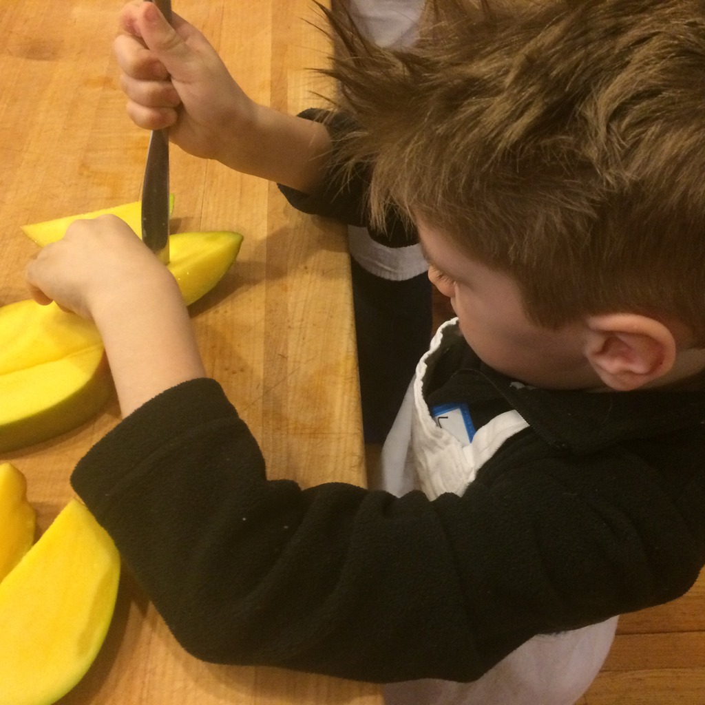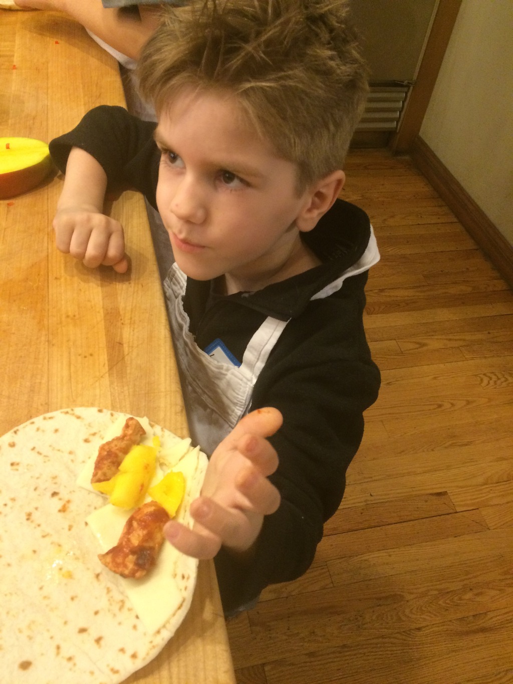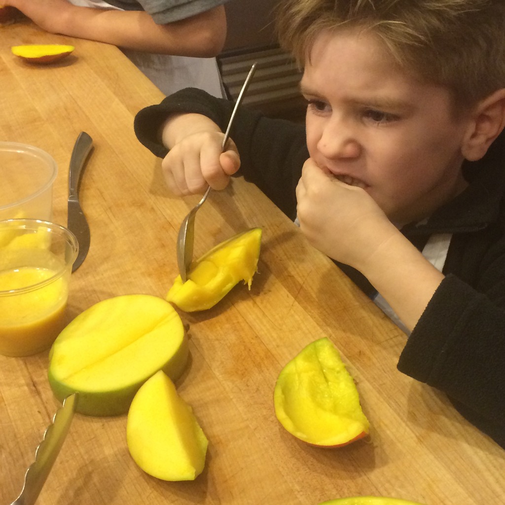 Luke learned how to make a Cinco De Mango Quesadilla and Frozen Yogurt Dipped Mango Pops. At first Luke was shy about the Mangoes but then once he realized how sweet and juicy they were he was hooked. .