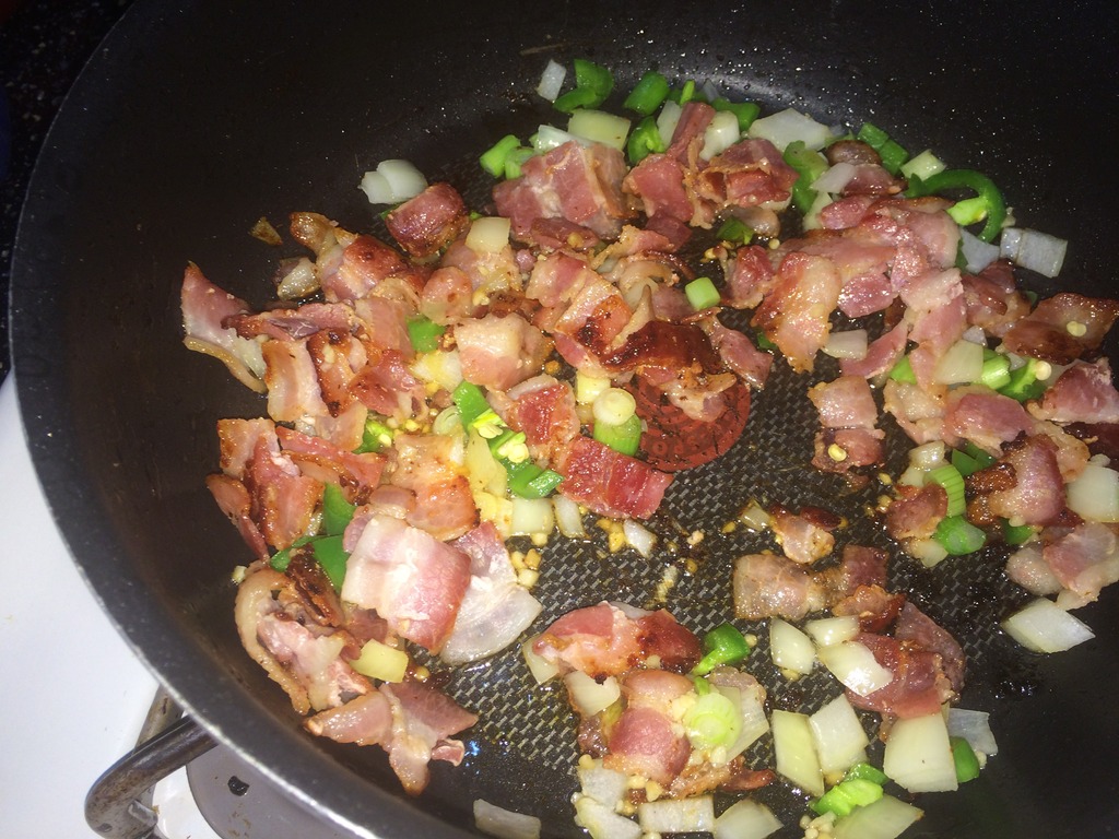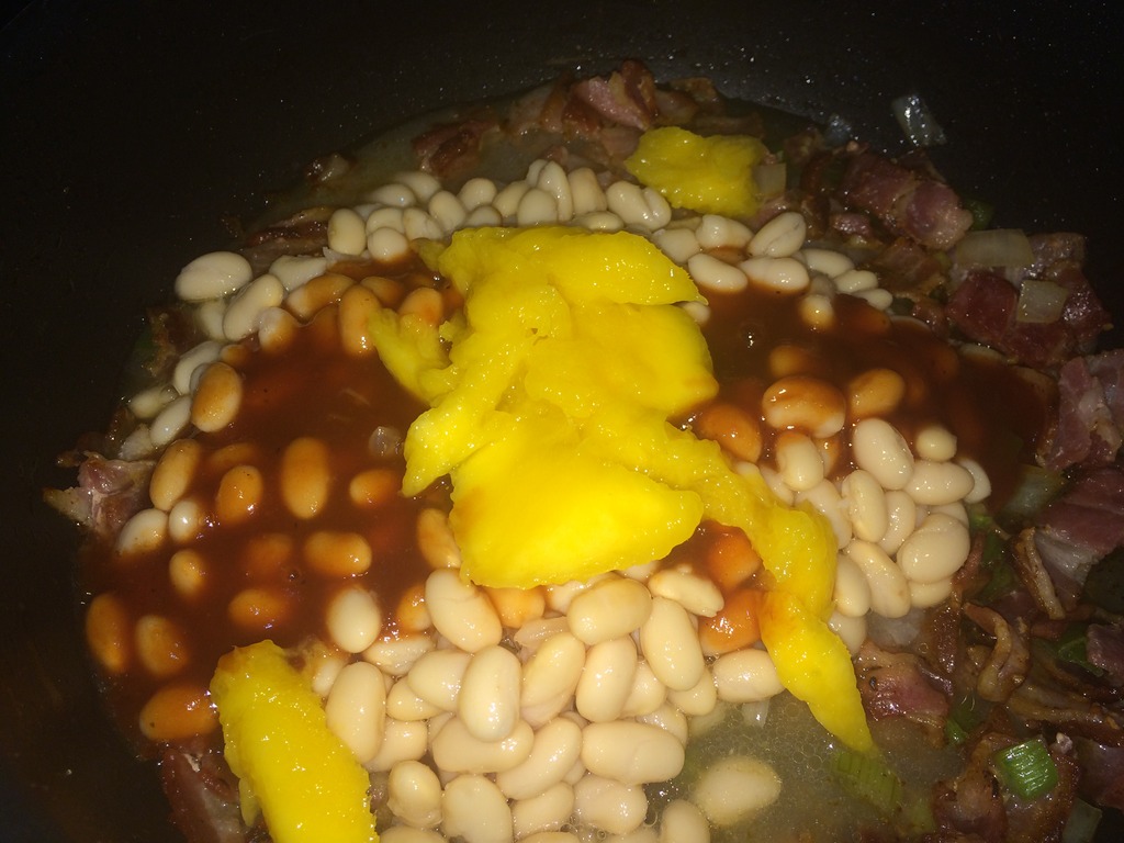 As soon as the bacon was crispy and onions were clear, I added the beans and combined the sauce. The last thing to add was the mango (mango can be pureed or in chunks). Everything needs to be stirred well together and then it needs to be baked in the oven.