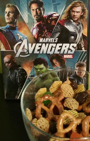 For the movie night we wanted to have a tasty snack besides just the popcorn so the boys helped create their own snack mix. We used Kellogg’s Crispix cereal, Nestle Raisinets, pretzels and Kellogg’s Avengers fruit snacks. The boys were thrilled to have created a snack they liked eating.