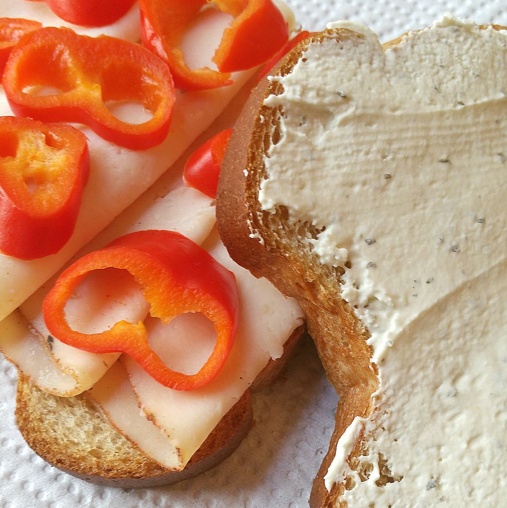 My kids tend to like simple sandwiches so I chose a few of their favorite ingredients to make something easy yet flavorful. Both boys like chicken so I chose to go with that for the meat (though turkey probably would have worked as well). Instead of mayo or mustard and cheese I decided to use an herbed cheese spread to give it that creamy taste we all love. The spread is also very kid-friendly so the boys can help make the sandwiches. For a little crunch I added red peppers since Jacob loves them and I thought it would add a little color to the sandwich.