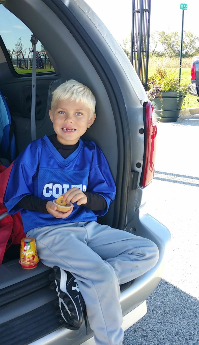 We made it through another busy football Sunday. We raced out the door this morning at eight, went through the drive thu for some caffeine, and got Jake to his pre-game practice just on time. By the time the game was starting Lucas had found a friend to play with and we had great seats on the sidelines.
