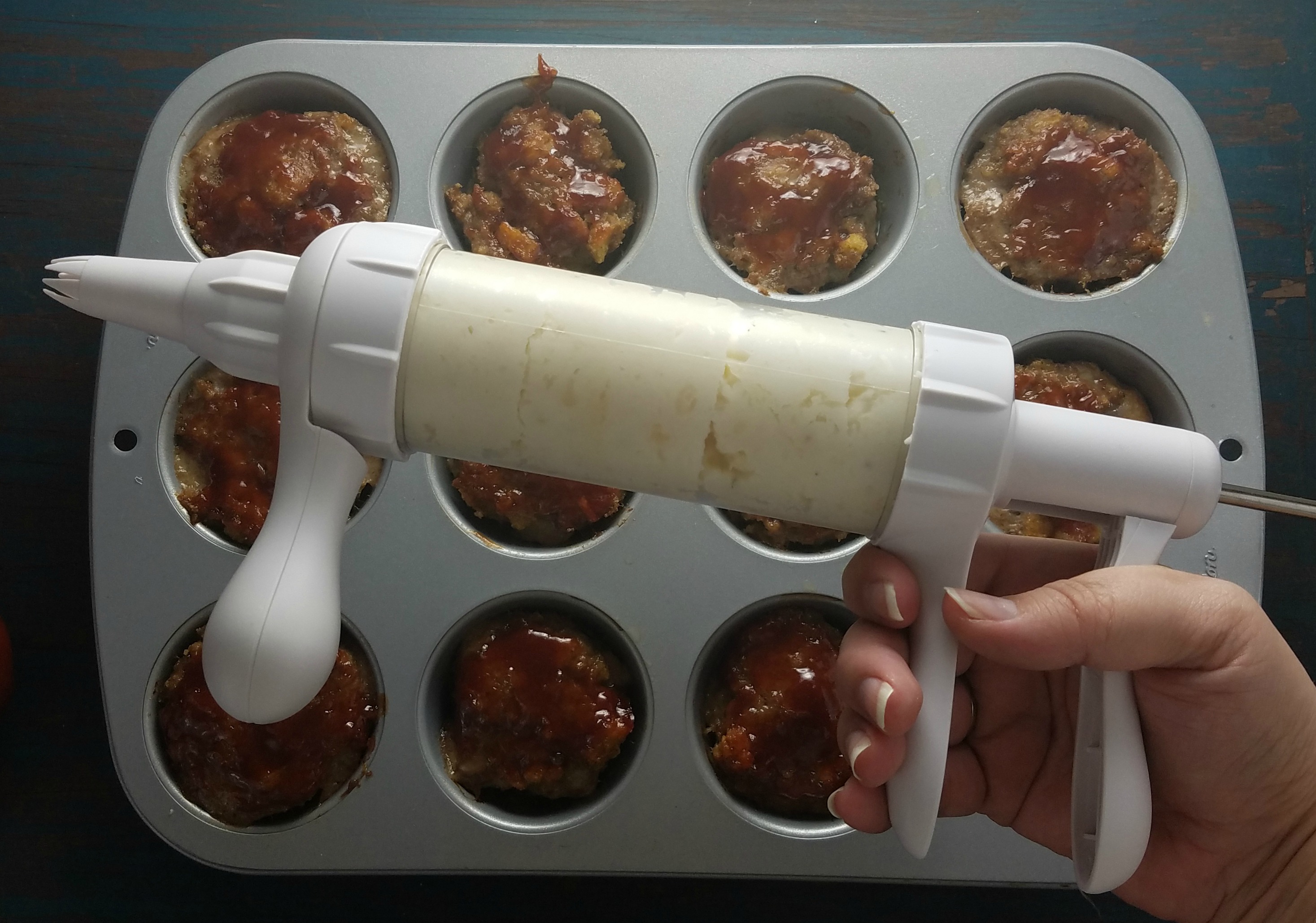 Spoon warmed mashed potatoes on to the meat. For fancier cupcake bites, you can make the mashed potatoes look like “frosting” that was piped on them. You can do this one of two ways- either by using a frosting decorator or using a sealed ziplock bag with one corner cut on a diagonal so the mashed potatoes can be piped out. I love using a frosting decorator with a special frosting tip.