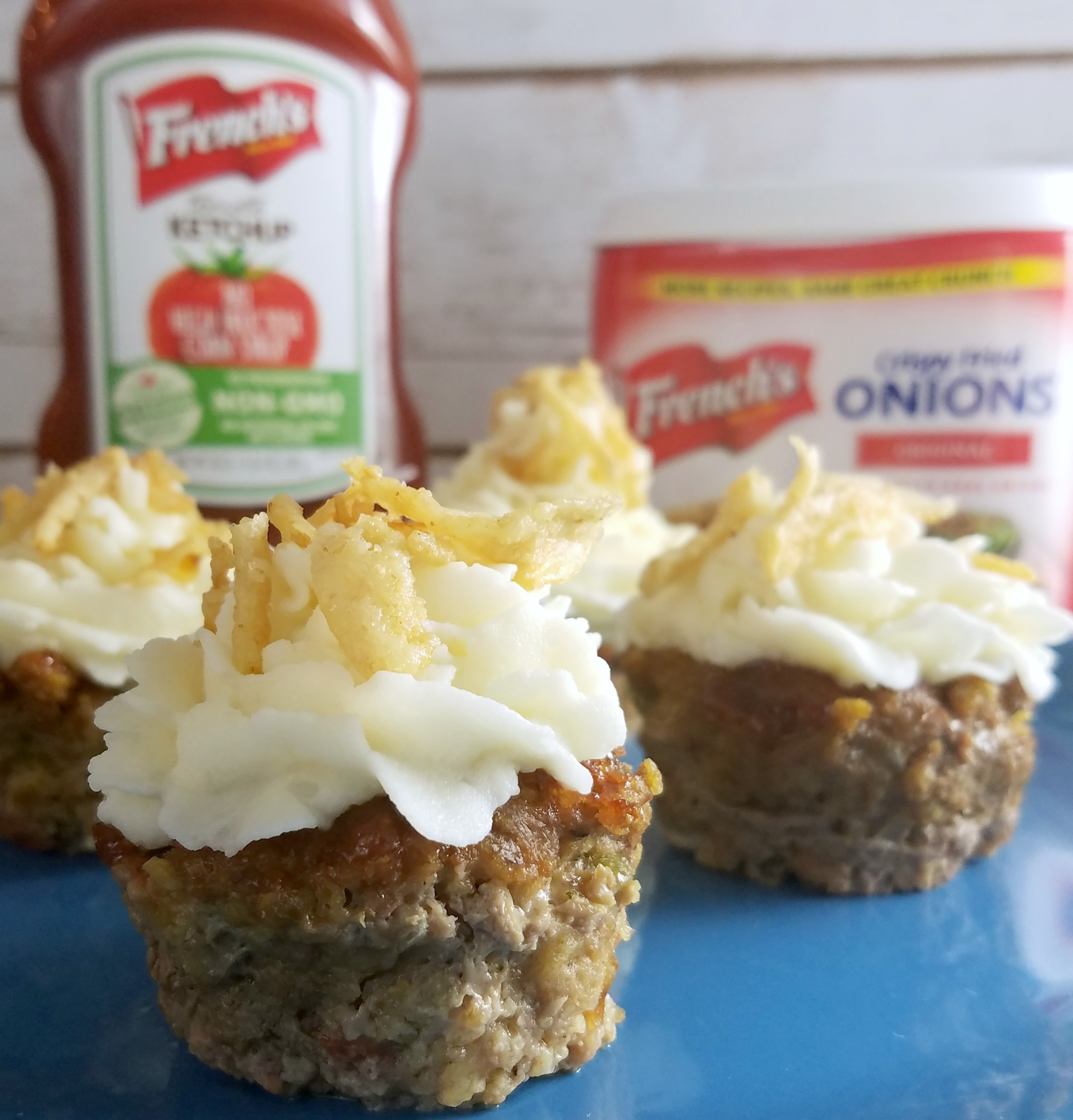 Serve as is or with French’s Crispy Fried Onions sprinkled on top. If you have someone in your family who does not like mashed potatoes you can serve the meatloaf without the mashed potato topping. A side of fries or tater tots with ketchup would be perfect with the plain meatloaf bites.