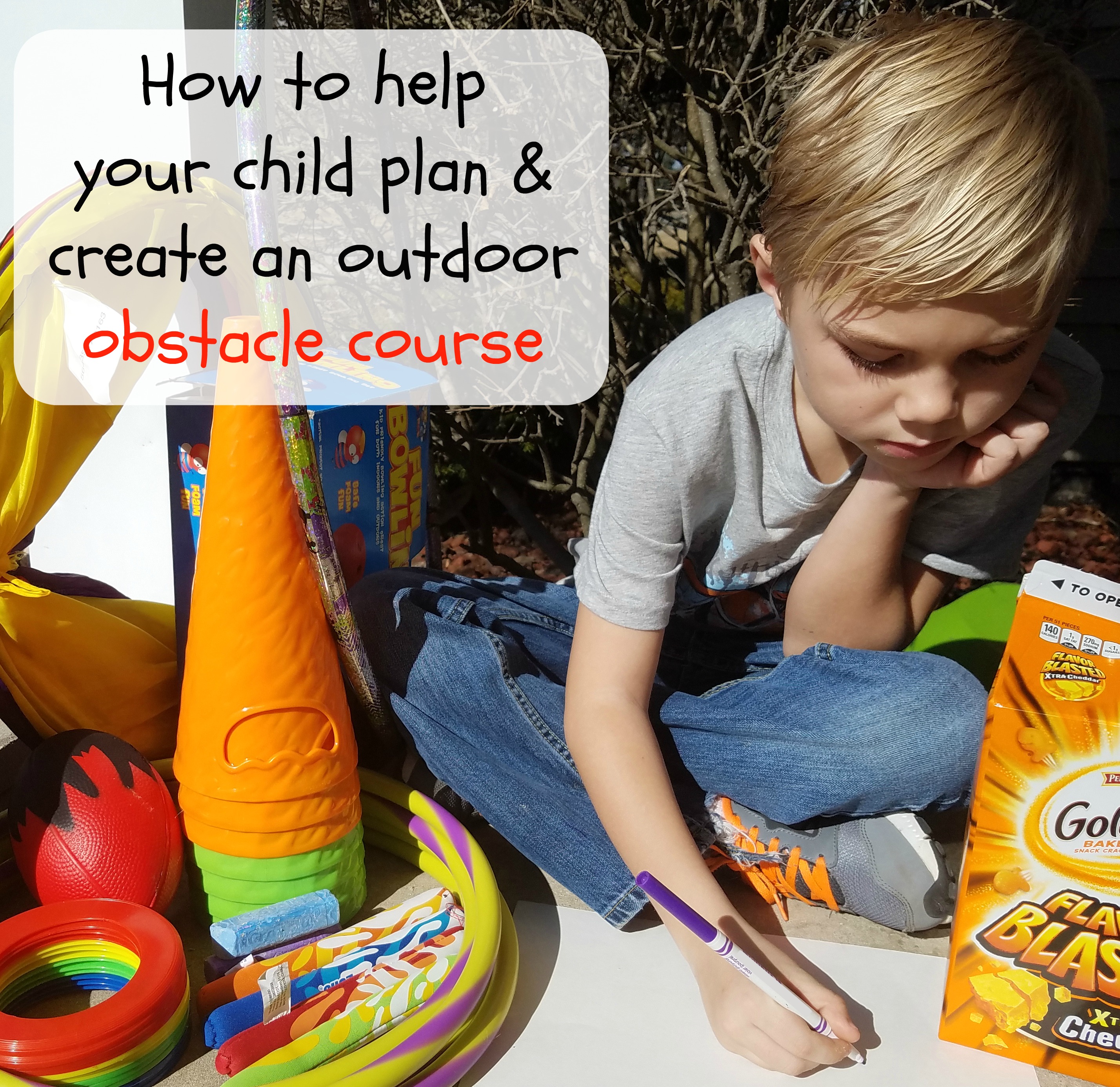 After you bring everything you need outside, have the child plan their obstacle course by drawing it out on paper. Having children plan the activity before they set it up helps them develop critical thinking skills.