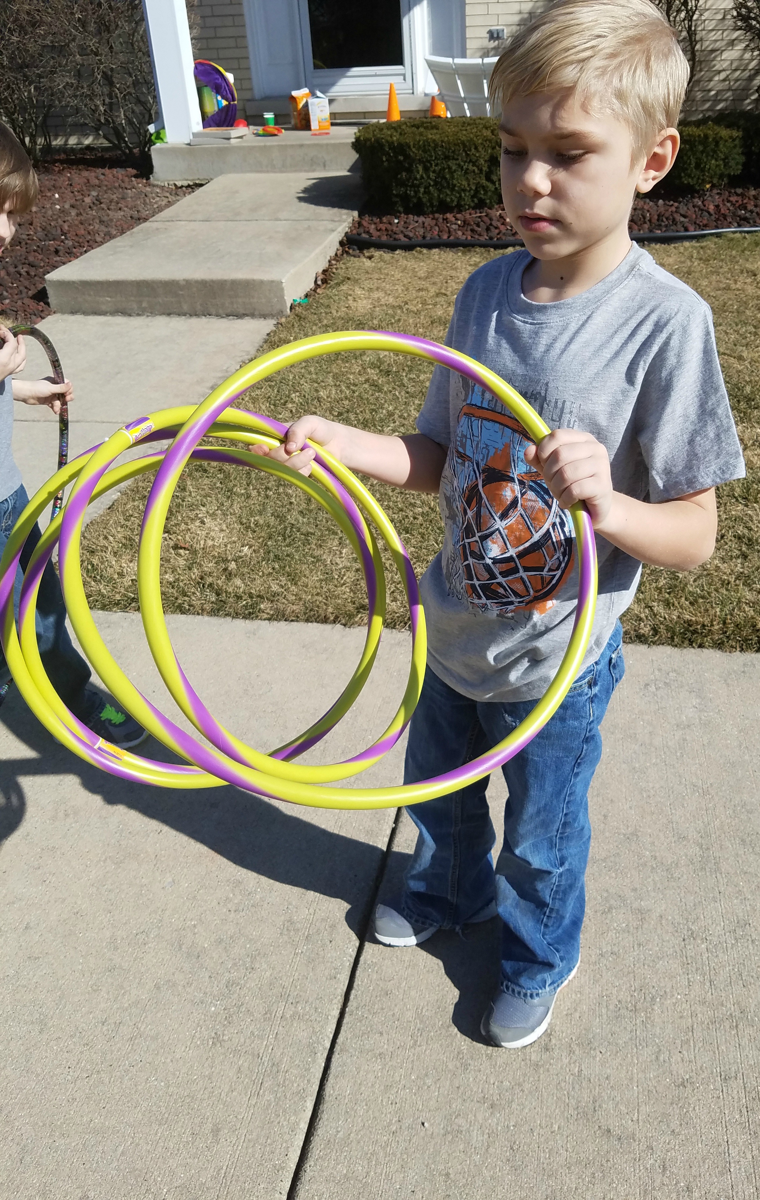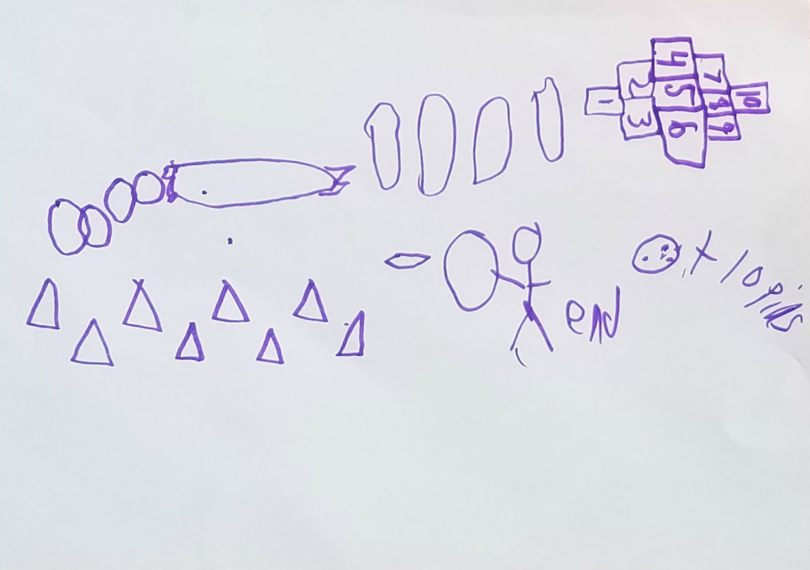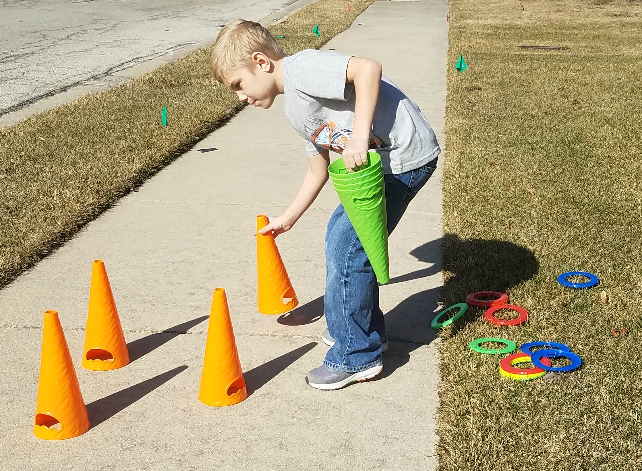 Jacob’s course involved jumping in hula hoops then going into a tunnel. Out of the tunnel he had put the relay batons down so that people would have to hop over each one. Next was a chalk drawn hopscotch and then a little bowling. After the person knocked all of the pins down he had cones set up and discs available to throw on each cone. The final obstacle was throwing a ball through a hula hoop someone was holding.