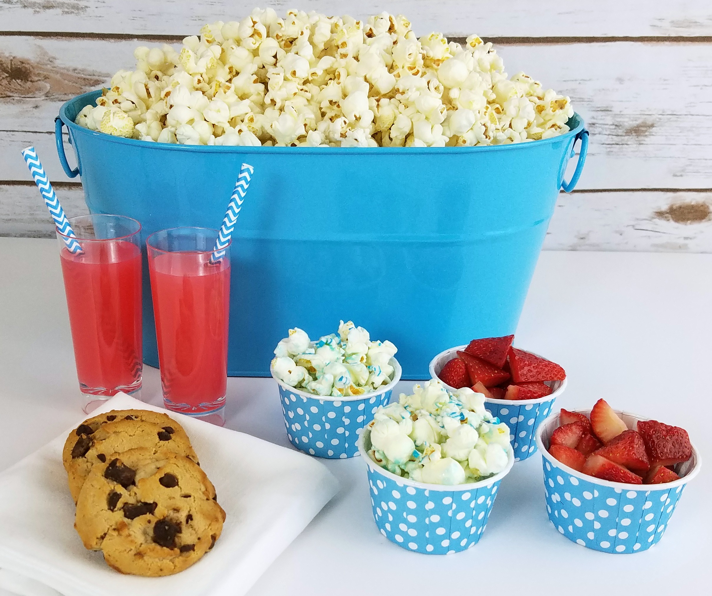 I chose to add in some {baby} blue colored elements including a blue bucket for the popcorn, blue and white chevron straws, a blue serving tray and individual cups that were blue with white polka dots.