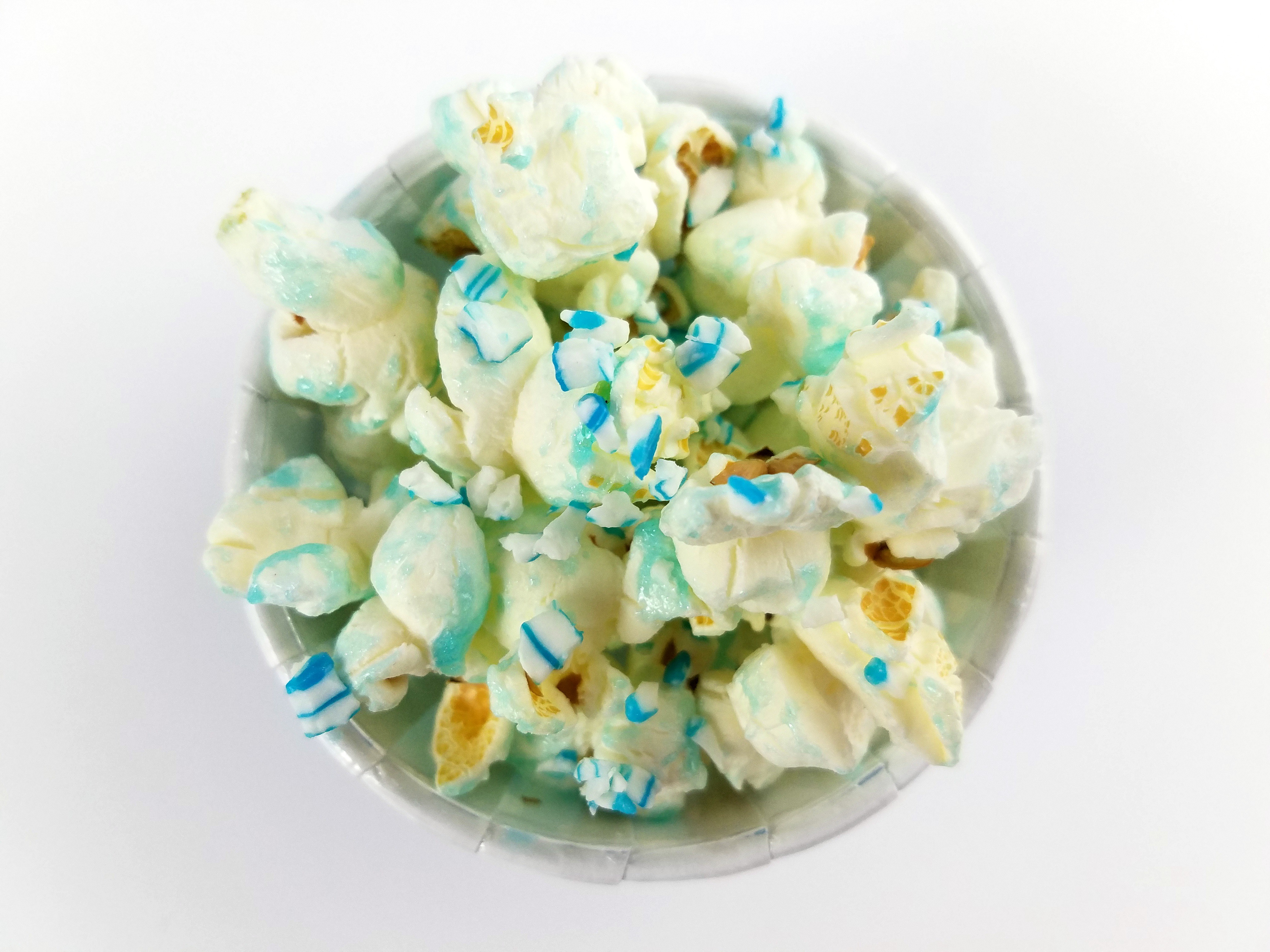 Popcorn is our usual go-to movie snack but I fancied it up a bit for this movie night. I mixed plain popcorn with a bit of blue decorating icing and separated them into little cups. I then sprinkled them with crushed blue and white candies.