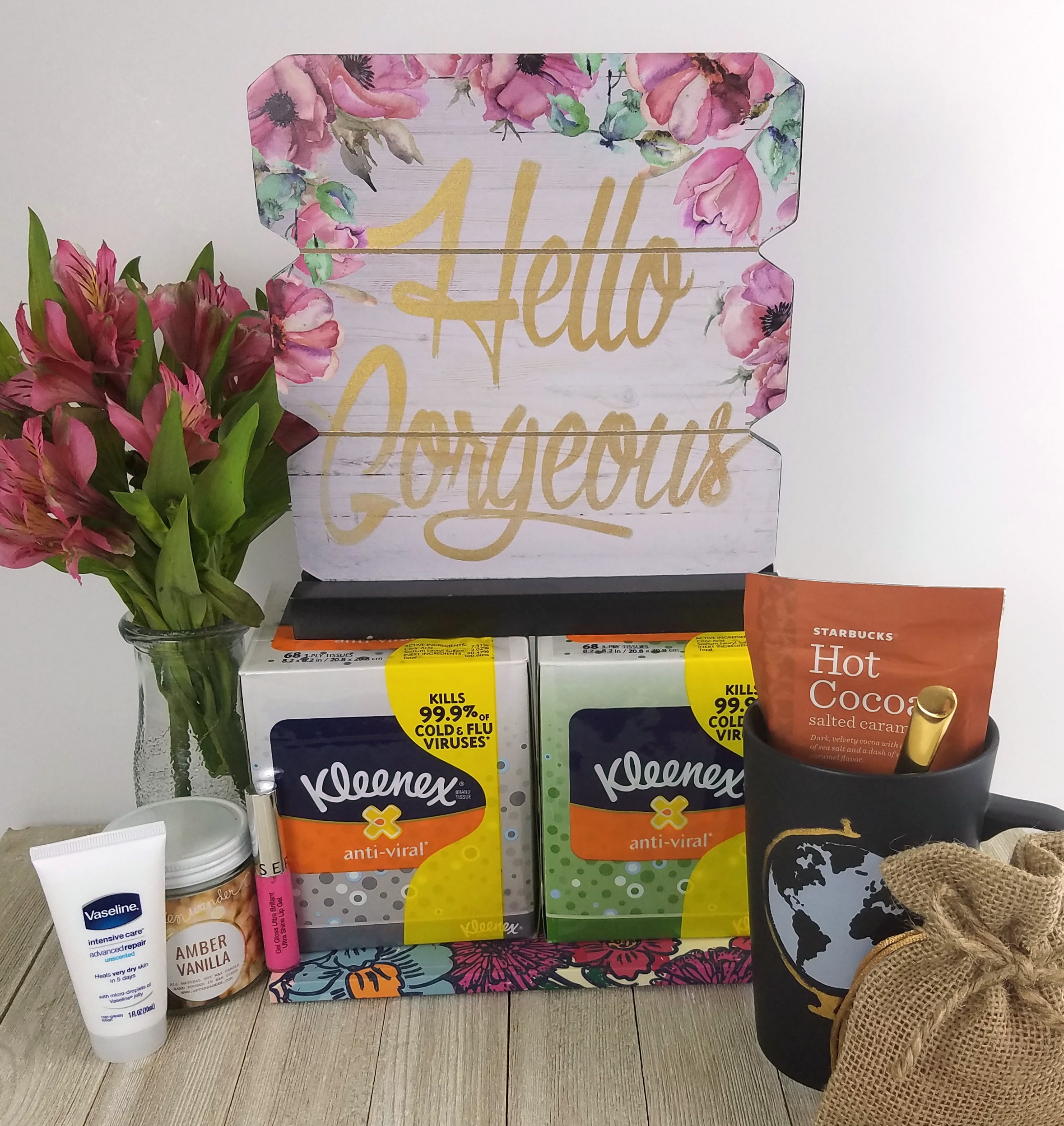 Things to make them feel pretty– I love this “hello gorgeous” sign (pictured above). Sometimes when we are sick the last thing we feel is gorgeous so this sign is a great reminder for us. You could also include a little tube of lip gloss because we all know that a little swipe of pink lip gloss adds a bit of a pretty glow to a tired face!