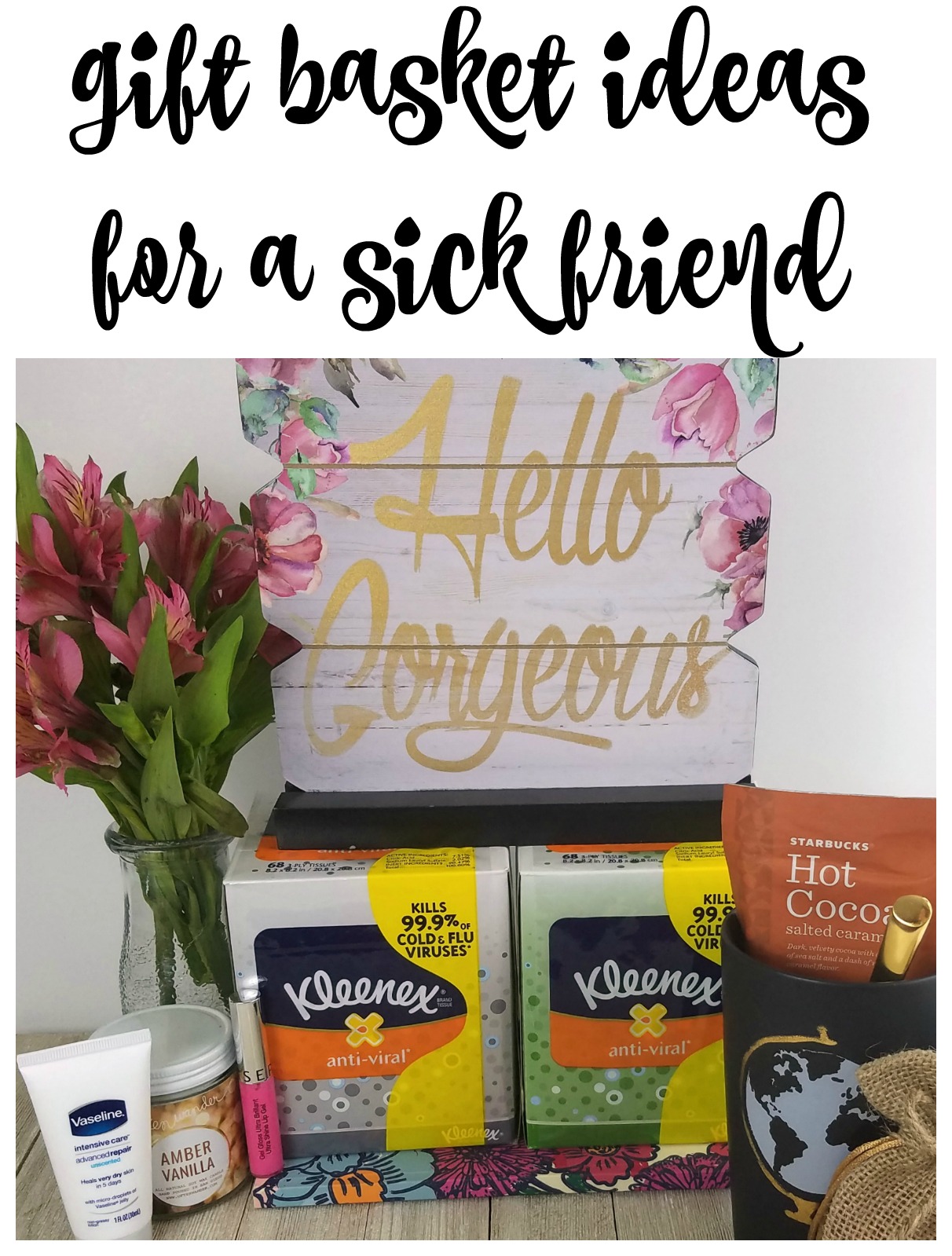 Great ideas: I just LOVE that Hello Gorgeous sign. Along with everything else in this gift basket for someone not feeling well, I bet that will surely put a smile on the sick one’s face and help cheer them up.