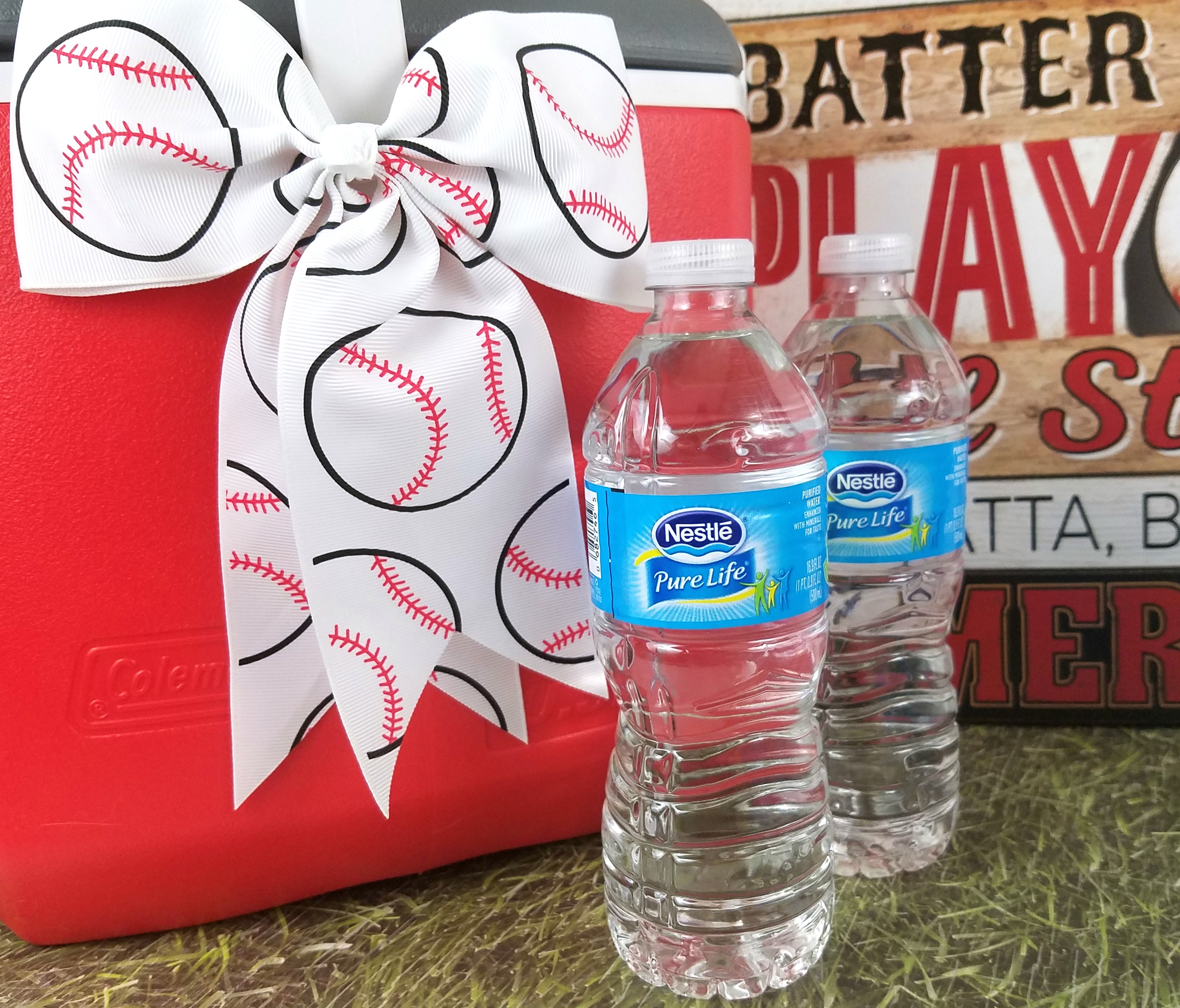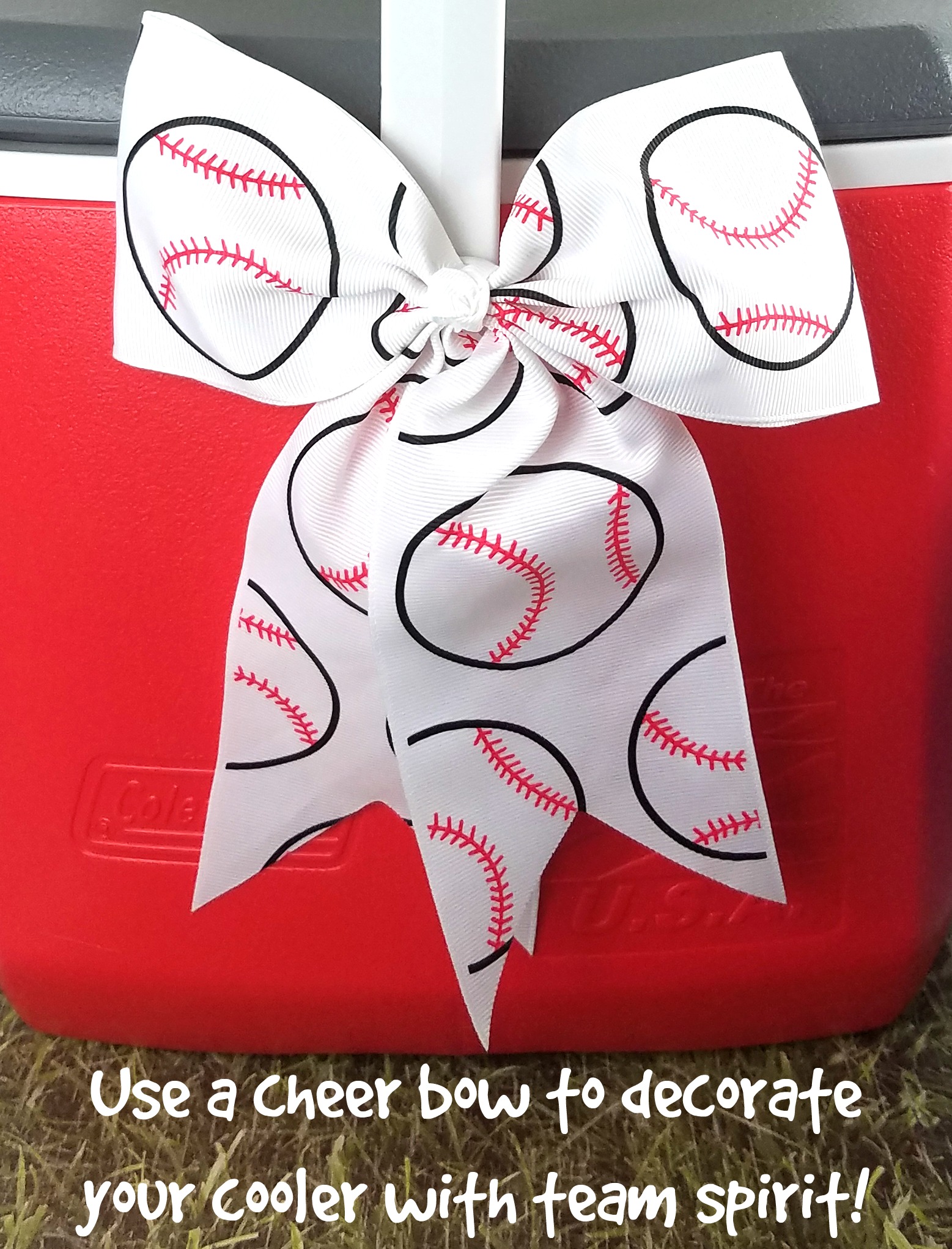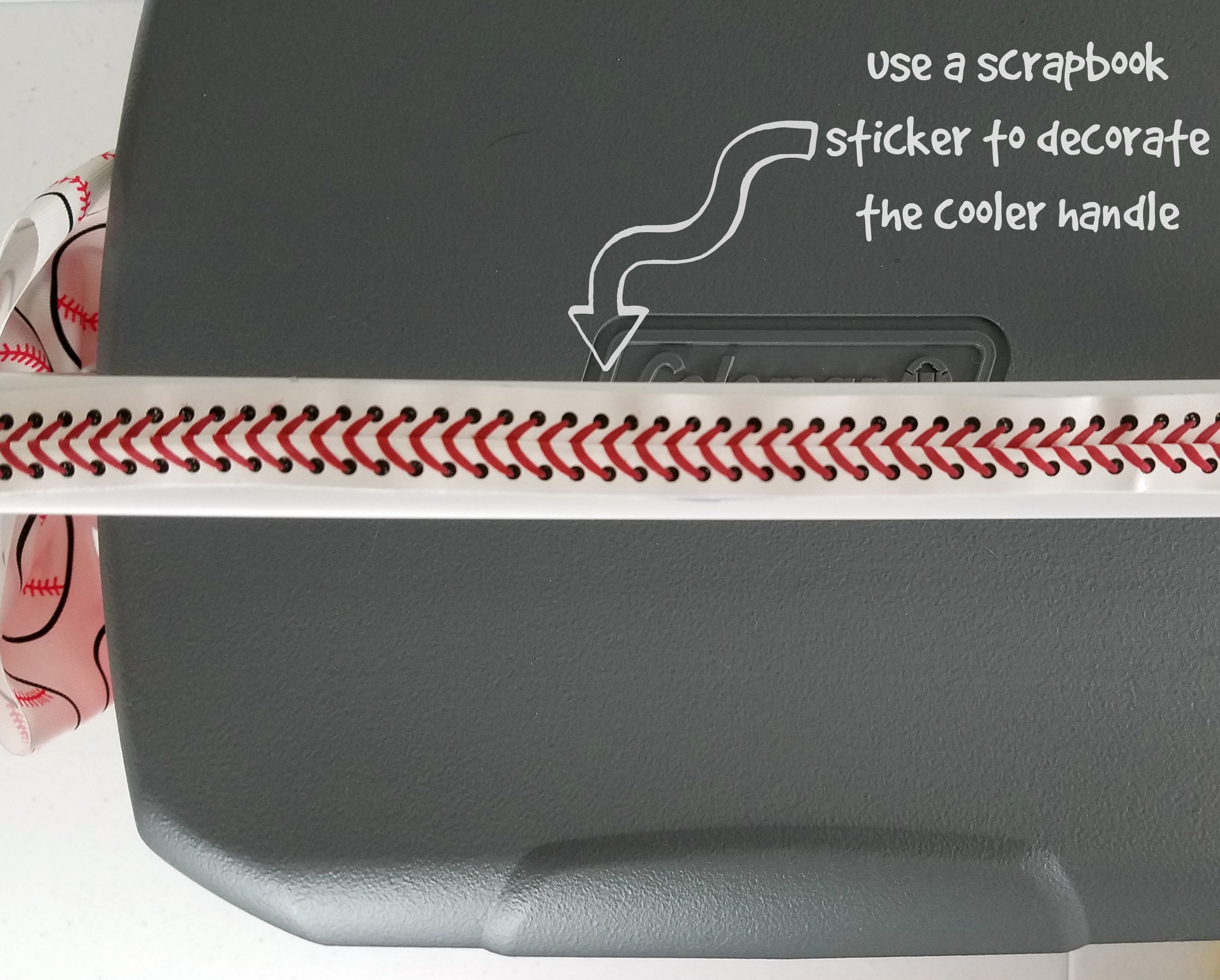 Tie the bows on the handle of the cooler and put the stickers on where you’d like to. I used two big cheer bows on the handle, a “baseball” sticker on the front of the cooler, and then put a long scrapbook sticker that looked like the lace of a baseball on the handle of the cooler.
