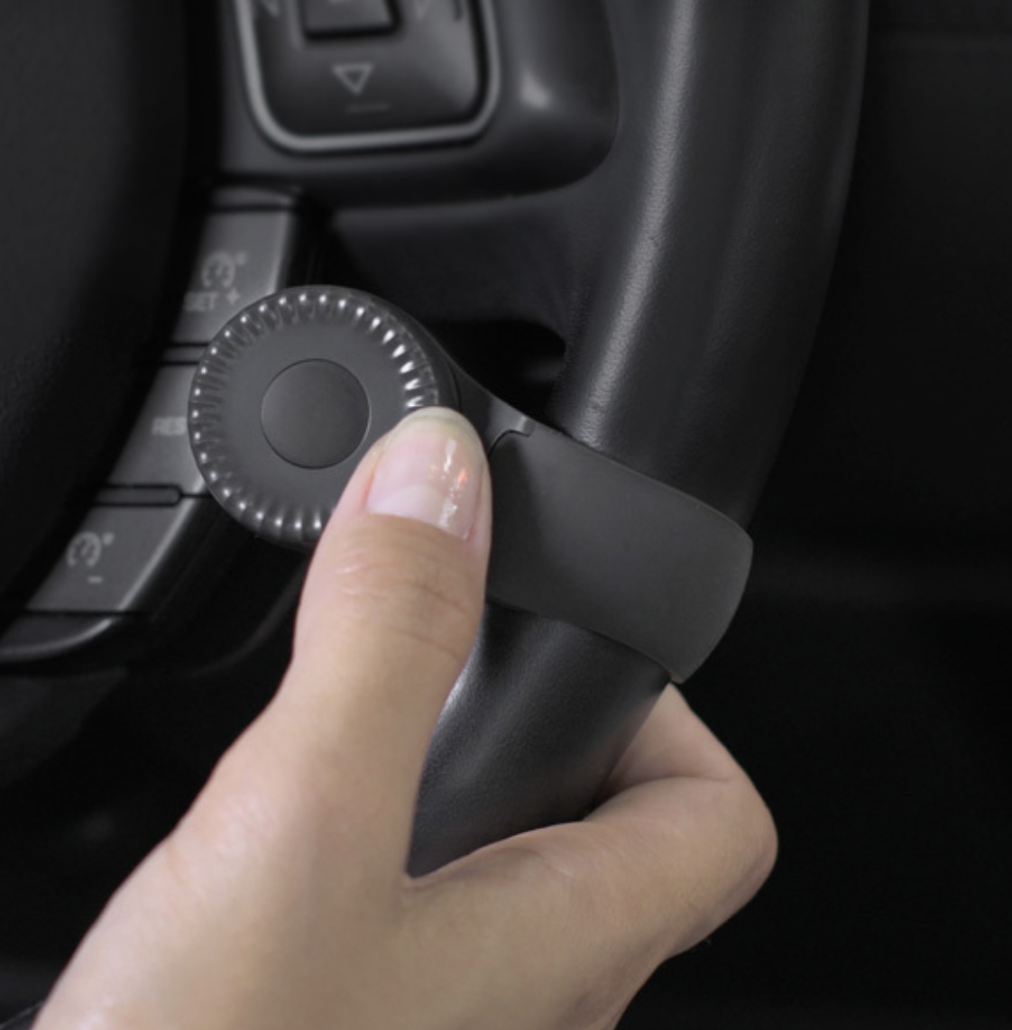 Once your display is mounted you will want to attach the dial to the steering wheel which is really simple to do. First, pick which side of the steering wheel you feel most comfortable with, then use the dial’s strap to fasten it securely with the dial on the inside of the steering wheel. The Navdy Dial is your main tool for interacting with your phone and the display while driving so make sure it’s in a place near where your hands sit naturally on the steering wheel. You can scroll through menu options by spinning the dial with your thumb, and can select songs, contacts, routes and more by tapping the button in the center.