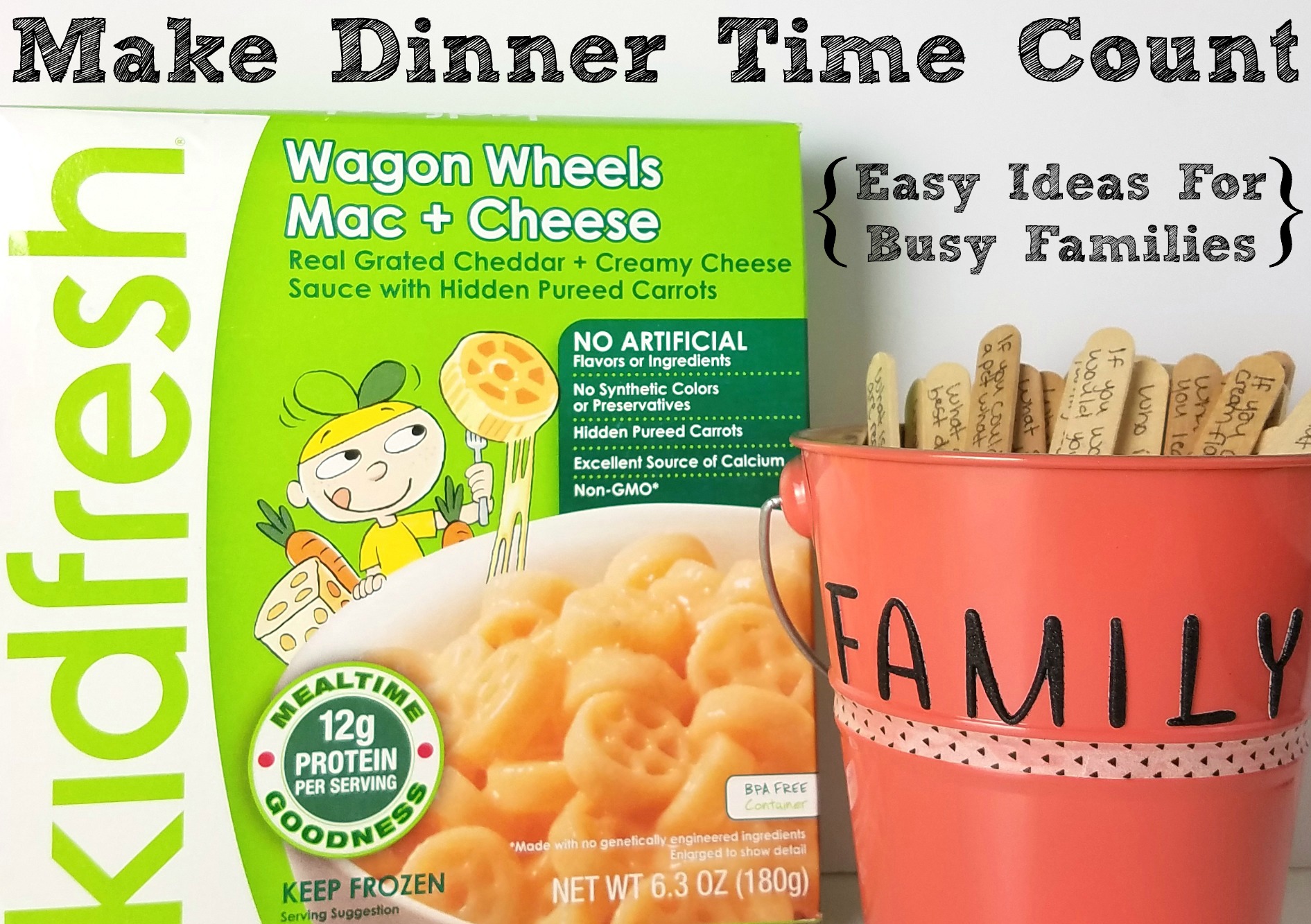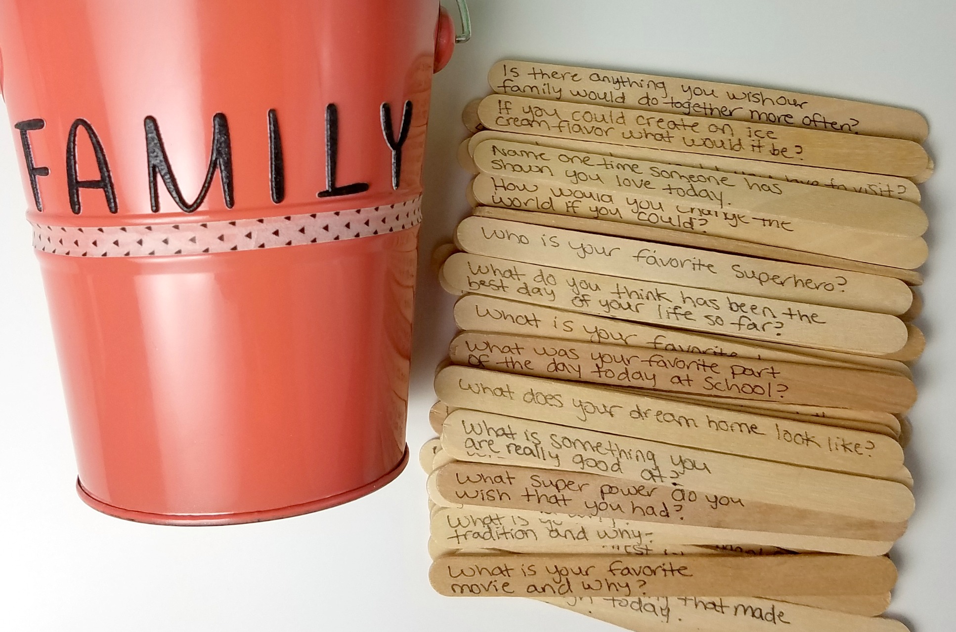 To keep the conversation going while the boys are enjoying their Kidfresh meals, and to avoid the typical answers of “fine” and “okay” when asked about their day, I created a conversation starters bucket to keep on the kitchen table. I wrote down about 50 questions on craft sticks that would require more than a “yes” or “no” answer and would hopefully start a conversation.