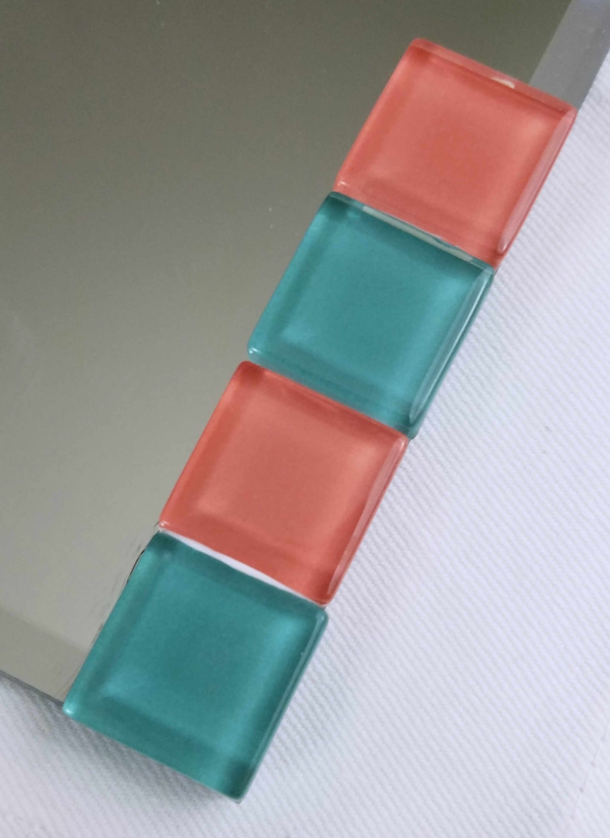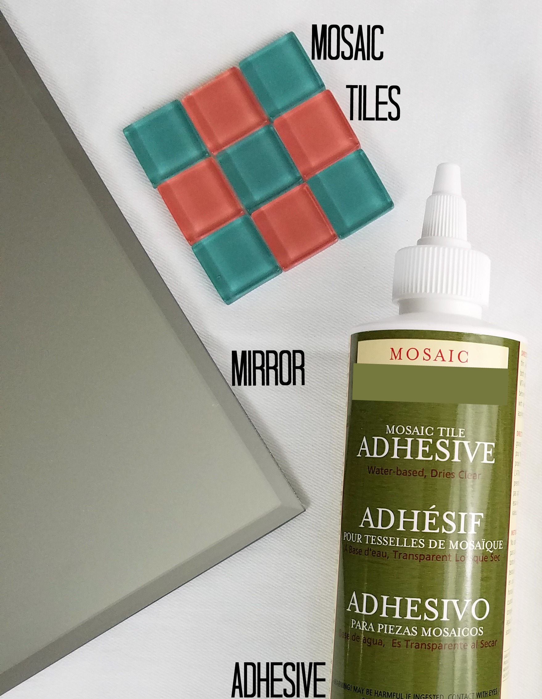 Use the adhesive to stick the tiles to the mirror. The adhesive dries quickly, so only do a small portion at a time. You can put glue on the mirror or on the back of the tiles. (I started putting it on the mirror but halfway through switched to putting the adhesive glue on the back of the tiles. Both methods worked, but putting it on the back of the tiles seemed to be less messier.)
