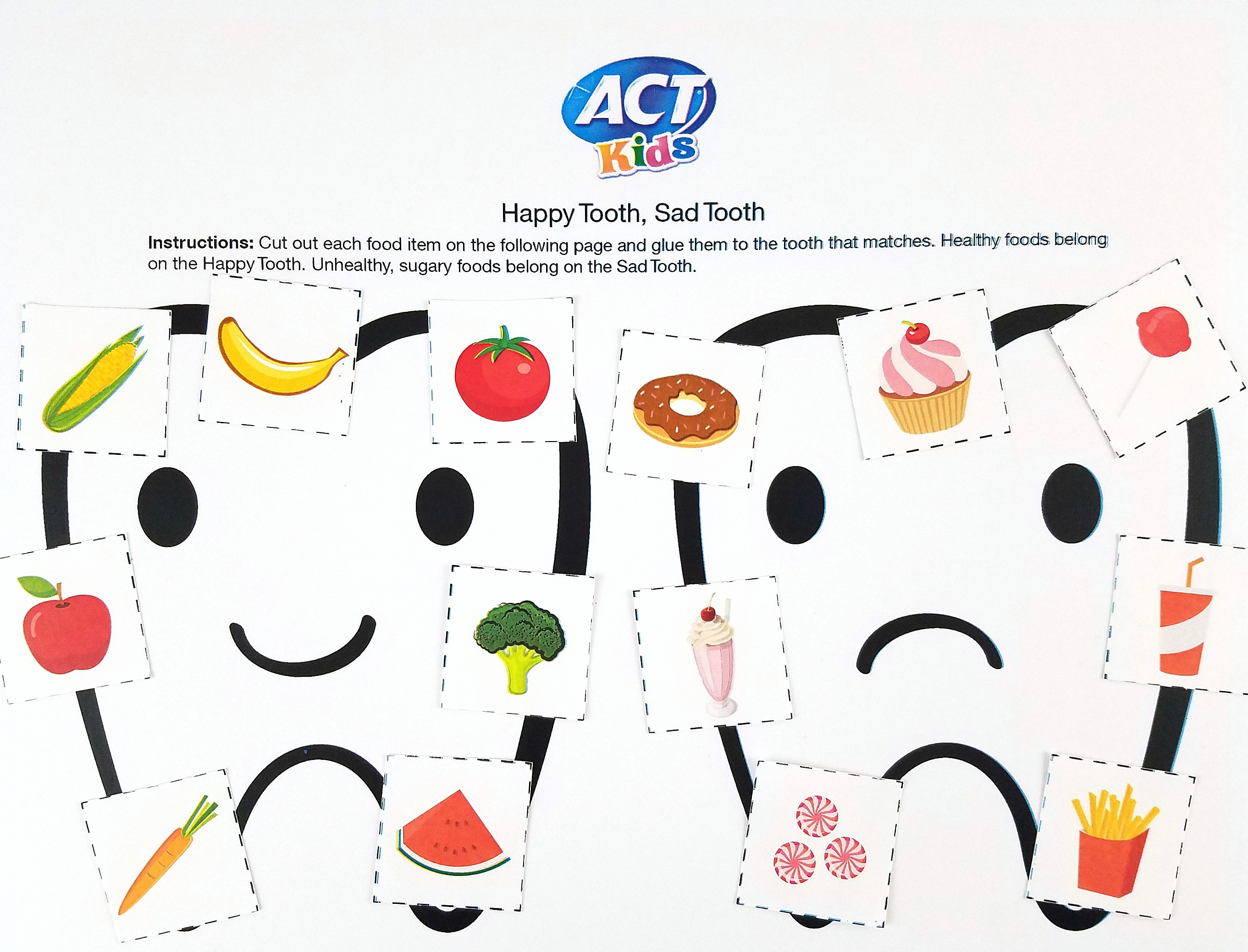 For younger children you can do a “happy tooth, sad tooth” activity. Draw and cut out two large teeth on paper and then draw a smile on one and a sad face on the other. Use clipart from the computer or cut out foods from grocery ads and then let your child sort the different foods and decide which ones make teeth “happy” and which ones make teeth “sad”. When they are done with the sorting activity they can color the teeth “happy” and “sad” colors as well.