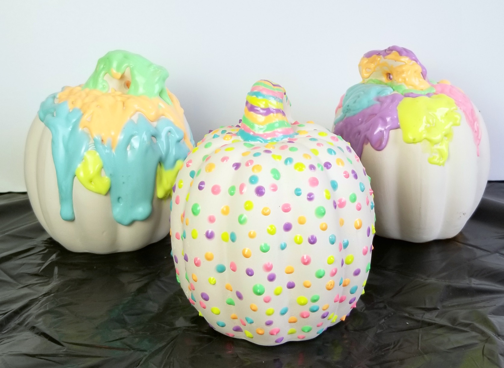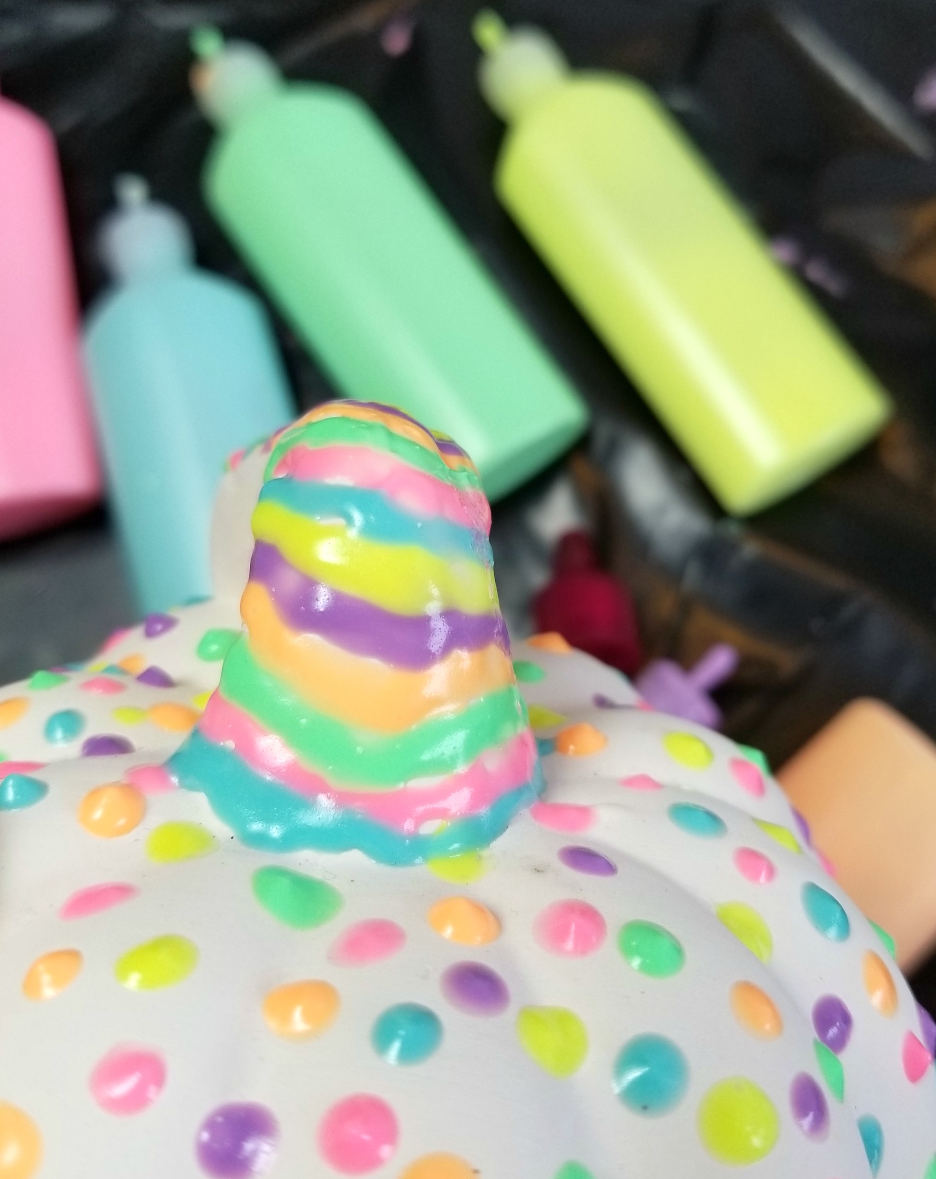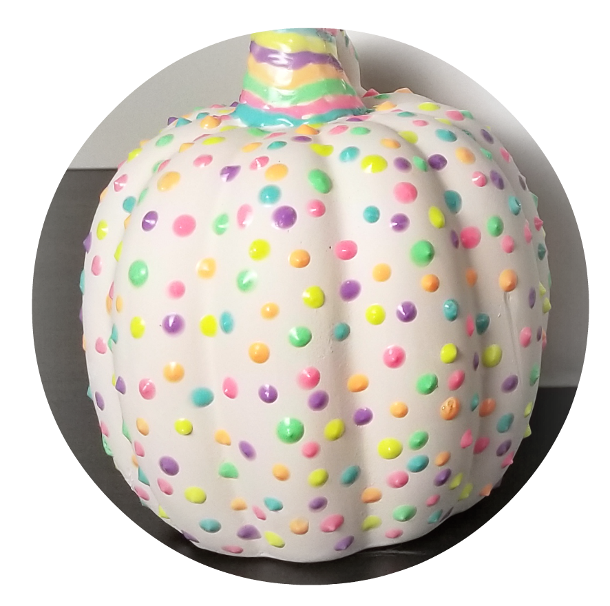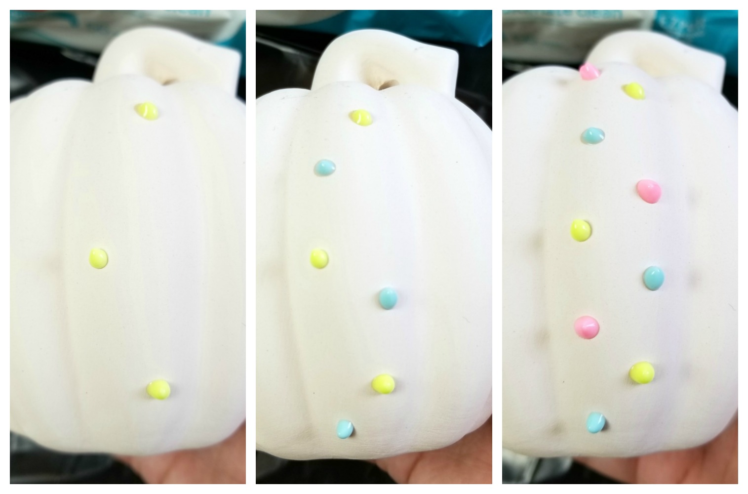 For my polka dot pumpkin, I made dots in one section at a time, making a few dots in one color before switching to another color to make three more dots, and so on before I moved to the next section.