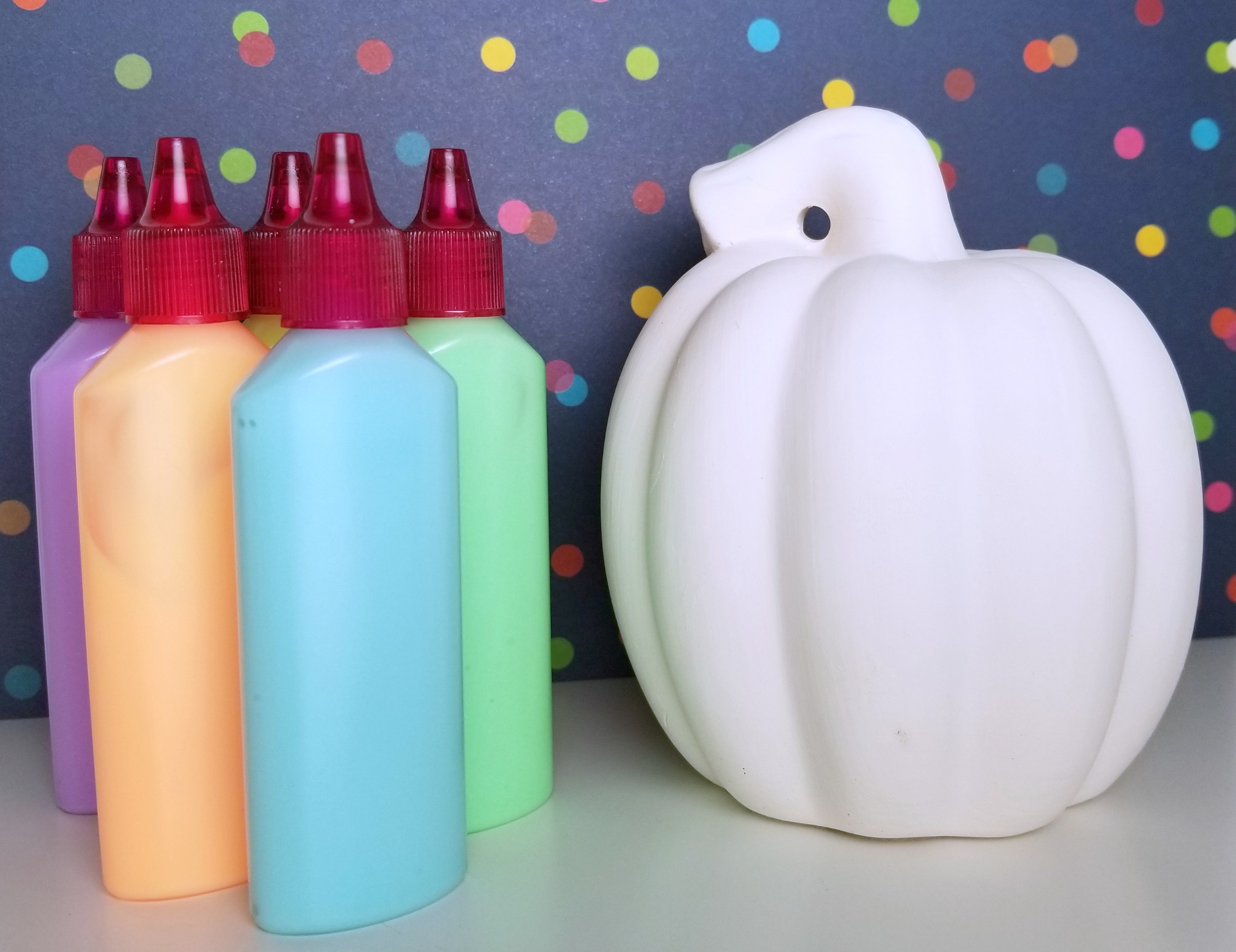 In addition, you can use paintbrushes to nicely spread the paint on but I discovered my kids just preferred to glob it on the pumpkins. (Slime is the big thing nowadays isn’t it?)