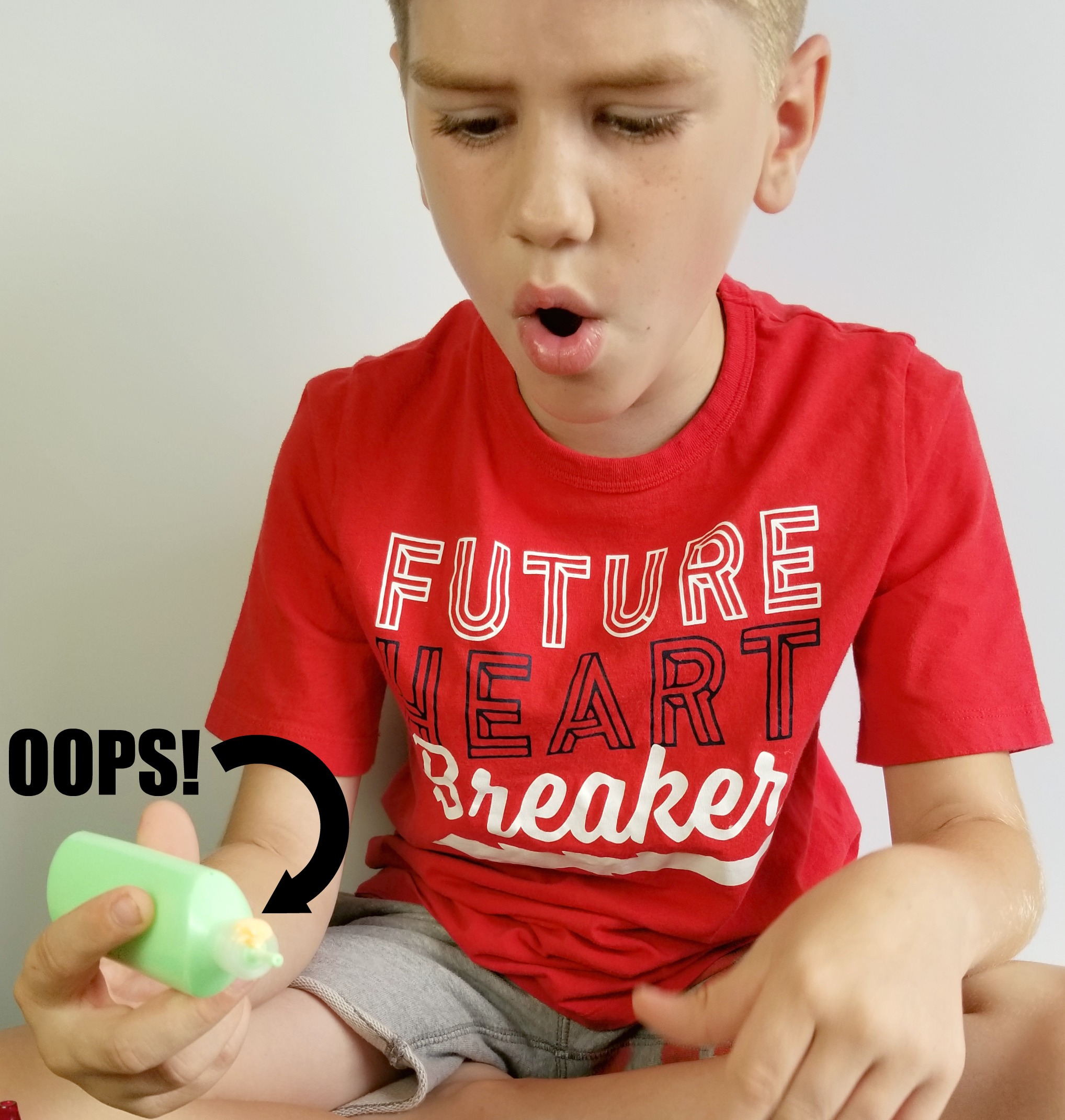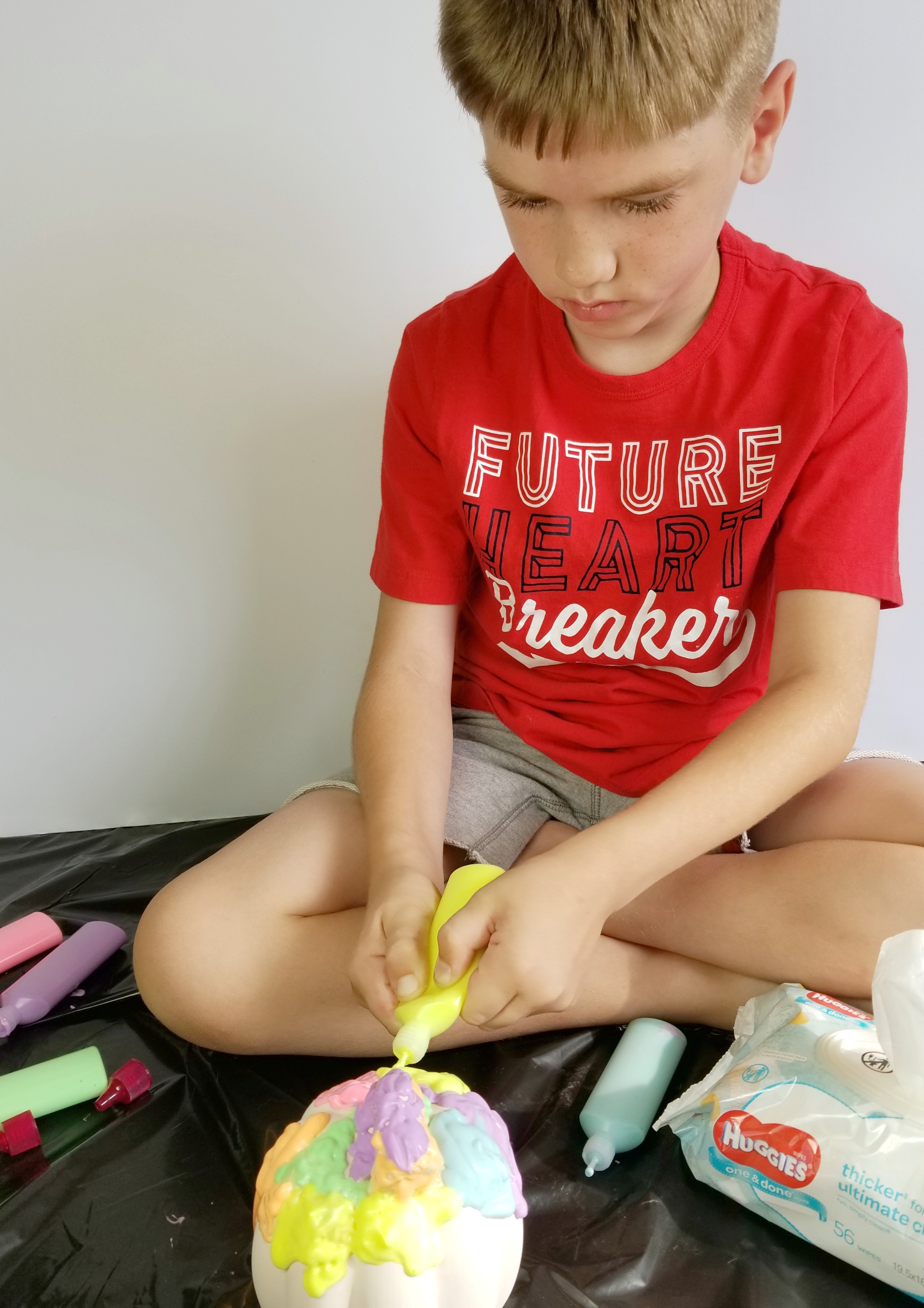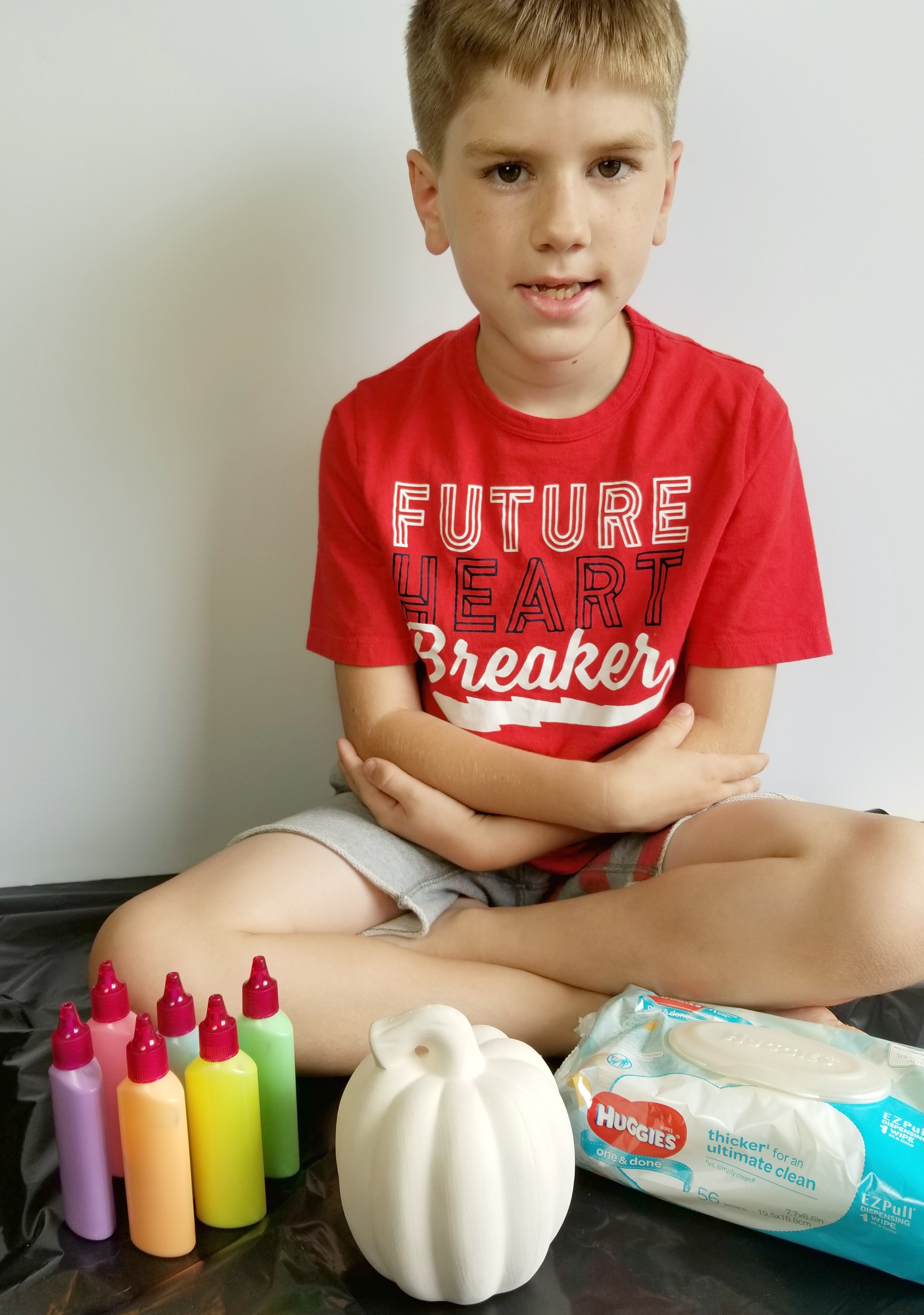 My boys may be 8 and 9 years old but I still find many uses for wipes and always have packs around my home and in my car. Sure enough, they came in handy for this messy activity. From wiping off “mistakes” on my pumpkin to wiping drips off the ground to cleaning messy hands (and legs and wherever else the paint ended up), I was happy we had them (and so was Lucas as you can see below lol).