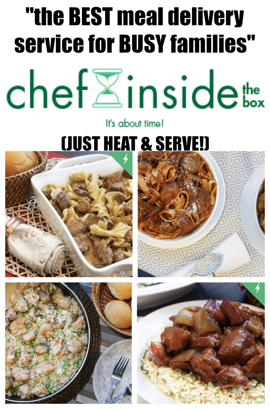 Then I discovered Chef Inside the Box, a Chicagoland meal delivery service that not only takes the hassle out of planning and grocery shopping, but also handles the tough prep and cook so you can just heat and enjoy! Most Chef Inside meals contain a few extra servings you can eat for lunch the next day so you are saving time there as well. Even better though? All this extra prep they do doesn’t mean it costs extra. In fact, from what I’ve seen, their cost per serving ($6.95) is less than the other services and shipping is free!