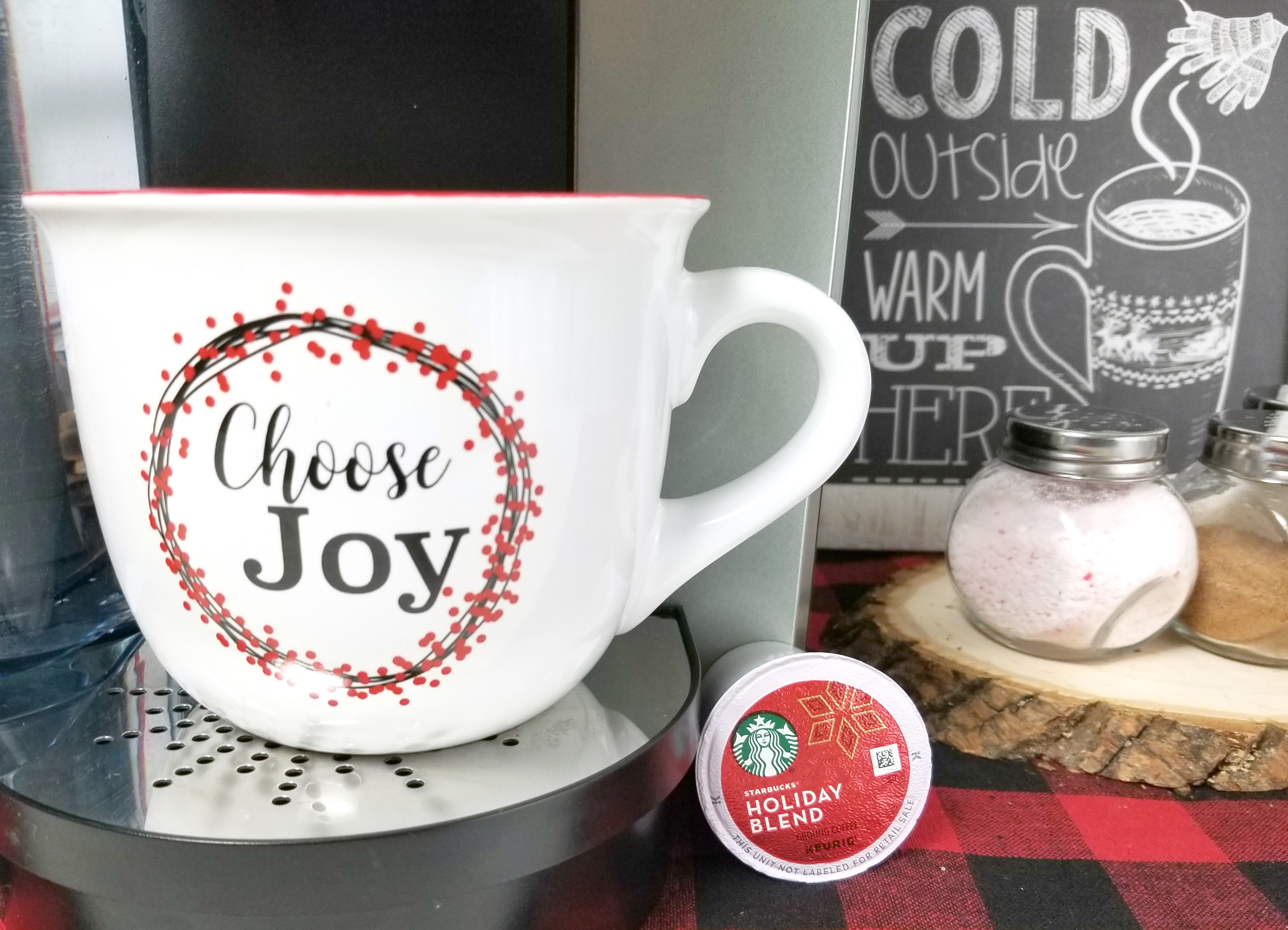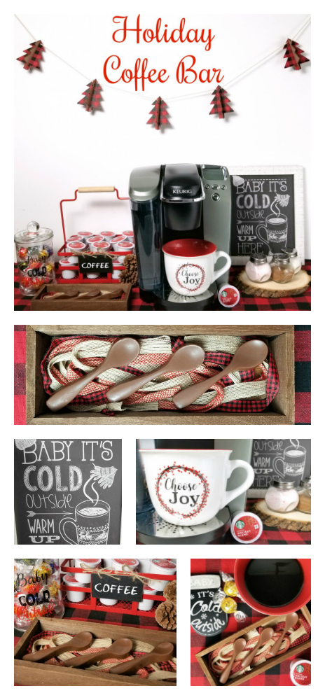 With the holidays quickly approaching I thought it would be fun to put together a coffee bar. I kept the decorations simple, going with a plaid tablecloth and red and wood accents. I love the “baby it’s cold outside” theme as well so I included a cute sign to encourage my guests to enjoy a warm cup of coffee.