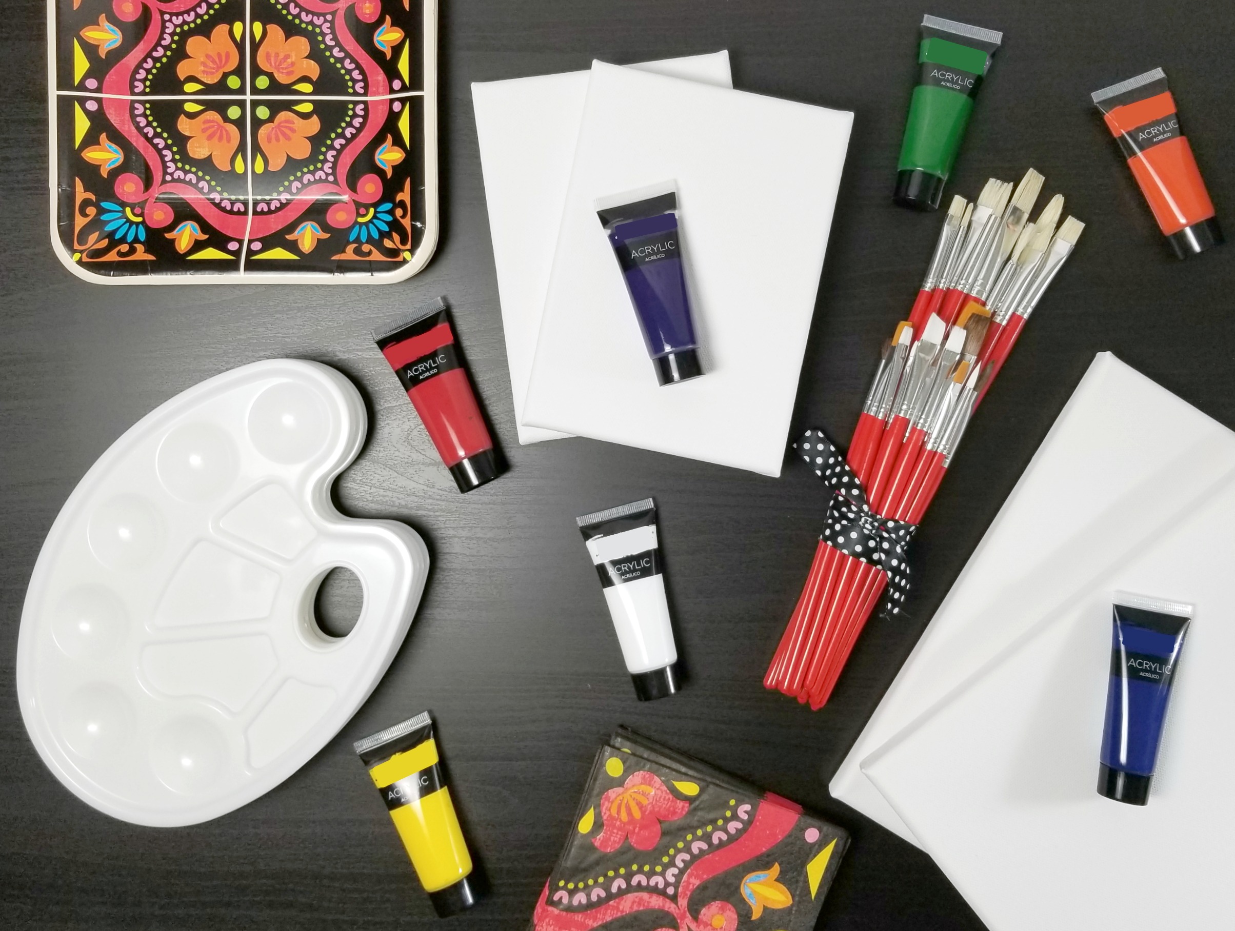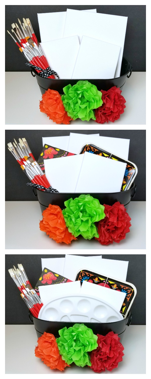 The gift basket is easy to put together. I used a black tin and decorated it with some paper flowers on the outside and added some crumpled paper inside the bottom of the tin. I added in canvases to paint (two 5X7 and two 8×10 sizes), paintbrushes, tubes of acrylic paint, paint palettes, and colorful napkins and plates for our dinner.
