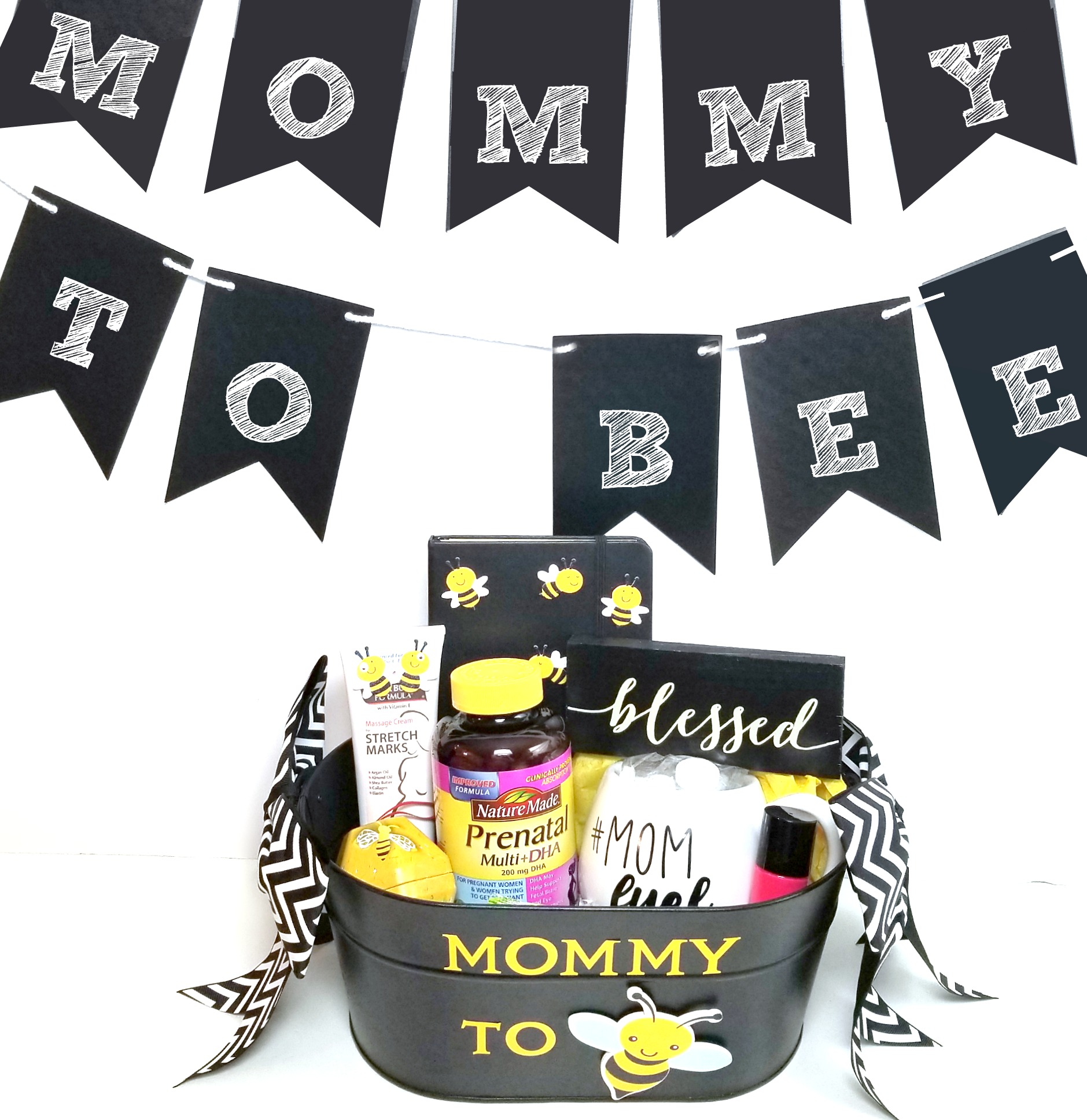 Before I added the things to my gift basket I decorated the outside of it with letters that say “mommy to” and then I added a large bee shape to make it “mommy to bee”. I added bows to the sides of the container to make it even cuter (I just can’t resist big bows and if the baby is a girl they can be used as hair ties when she gets older). Once you’re done decorating the outside you can add some crinkle paper and tissue paper inside the basket as a base for all the goodies if you’d like.