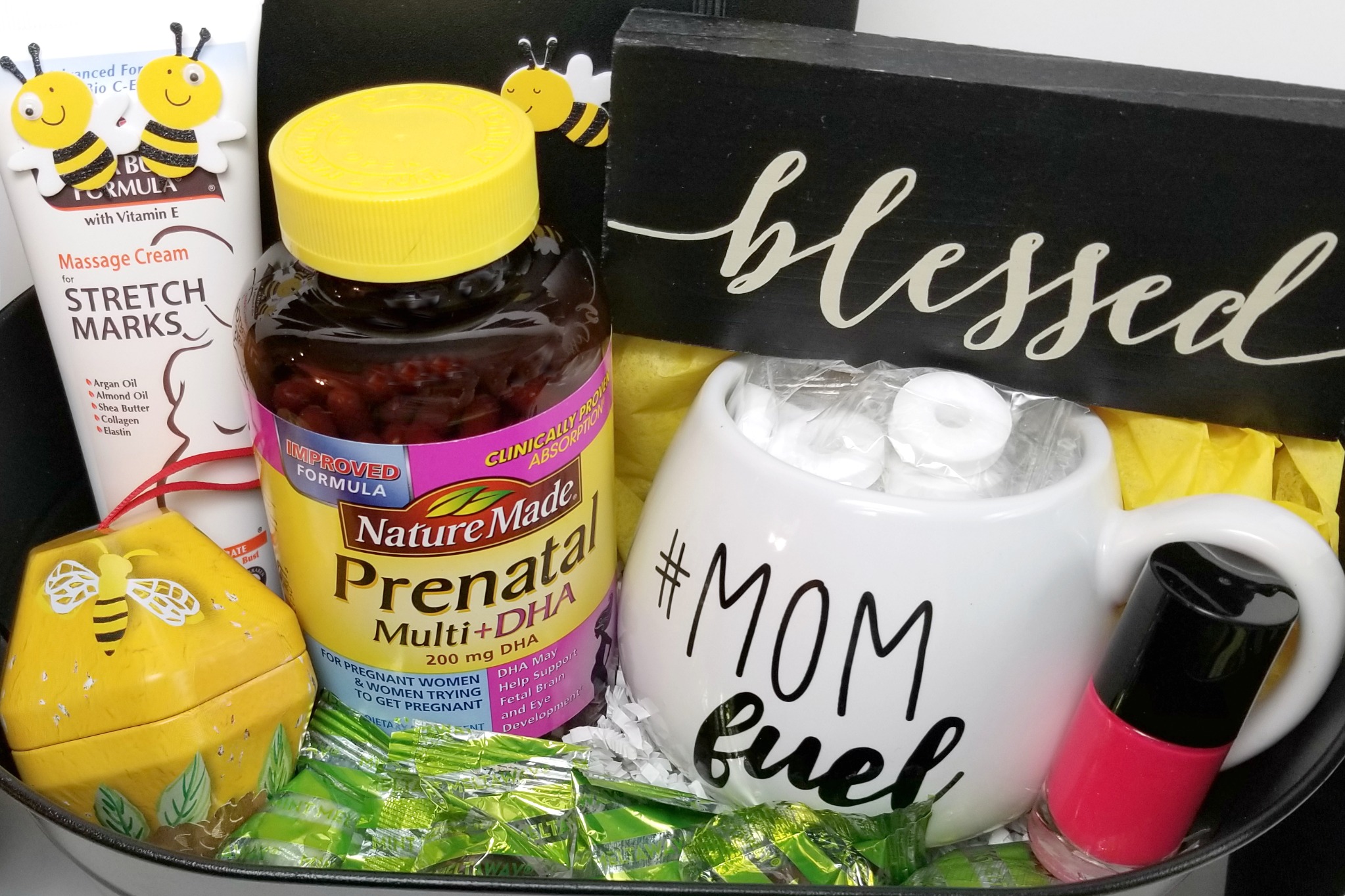 I look back on my pregnancies and I would love to have those prenatal vitamins with DHA. The rest of the basket is fun and a nice gift to give, but the vitamins are key.