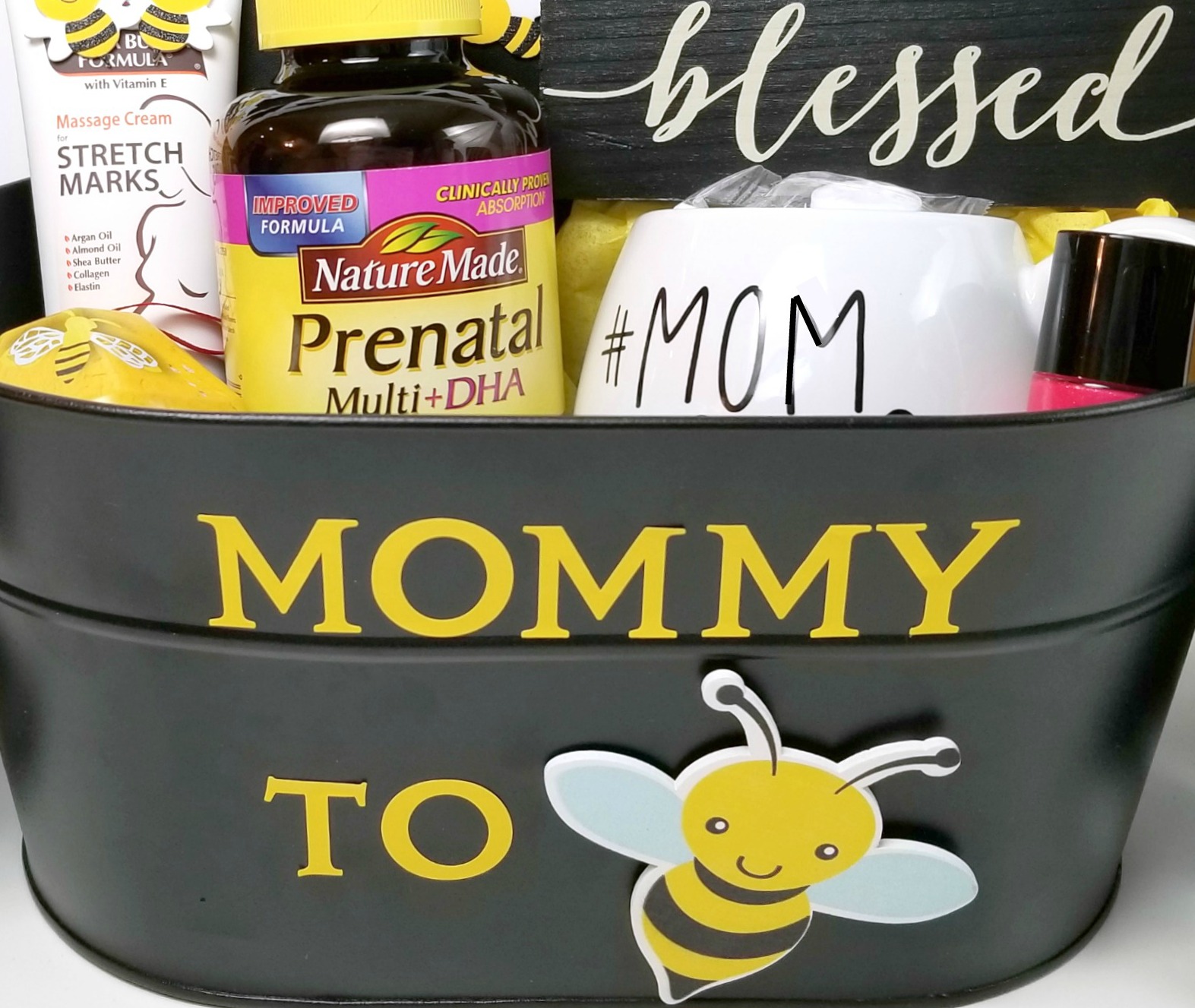 I think that one of life’s greatest blessings is children so it’s no wonder that pregnancy is celebrated like it is in our culture. From baby showers to gifts, moms to be are often overwhelmed with love from their friends and family. I created a cute little “Mommy to Bee” gift basket that is perfect to give as a gift to someone who is expecting. What you include can depend on the mom that’s receiving the gift basket but I included some necessities that I used when I was pregnant with my own boys.
