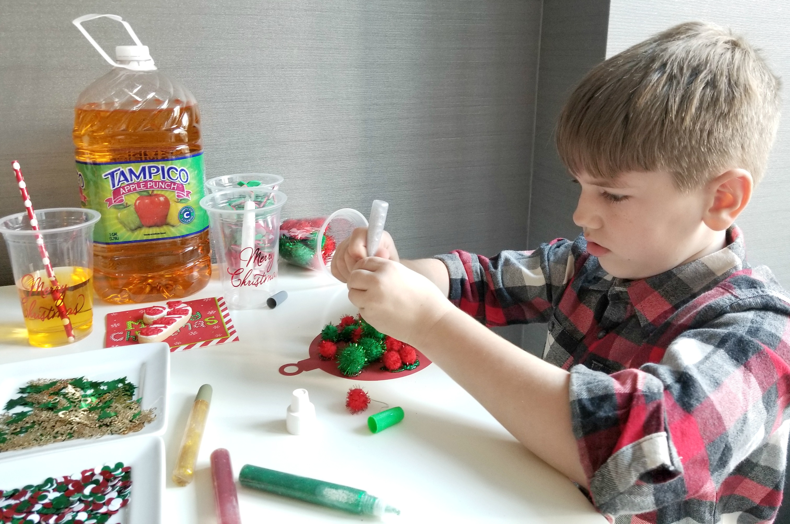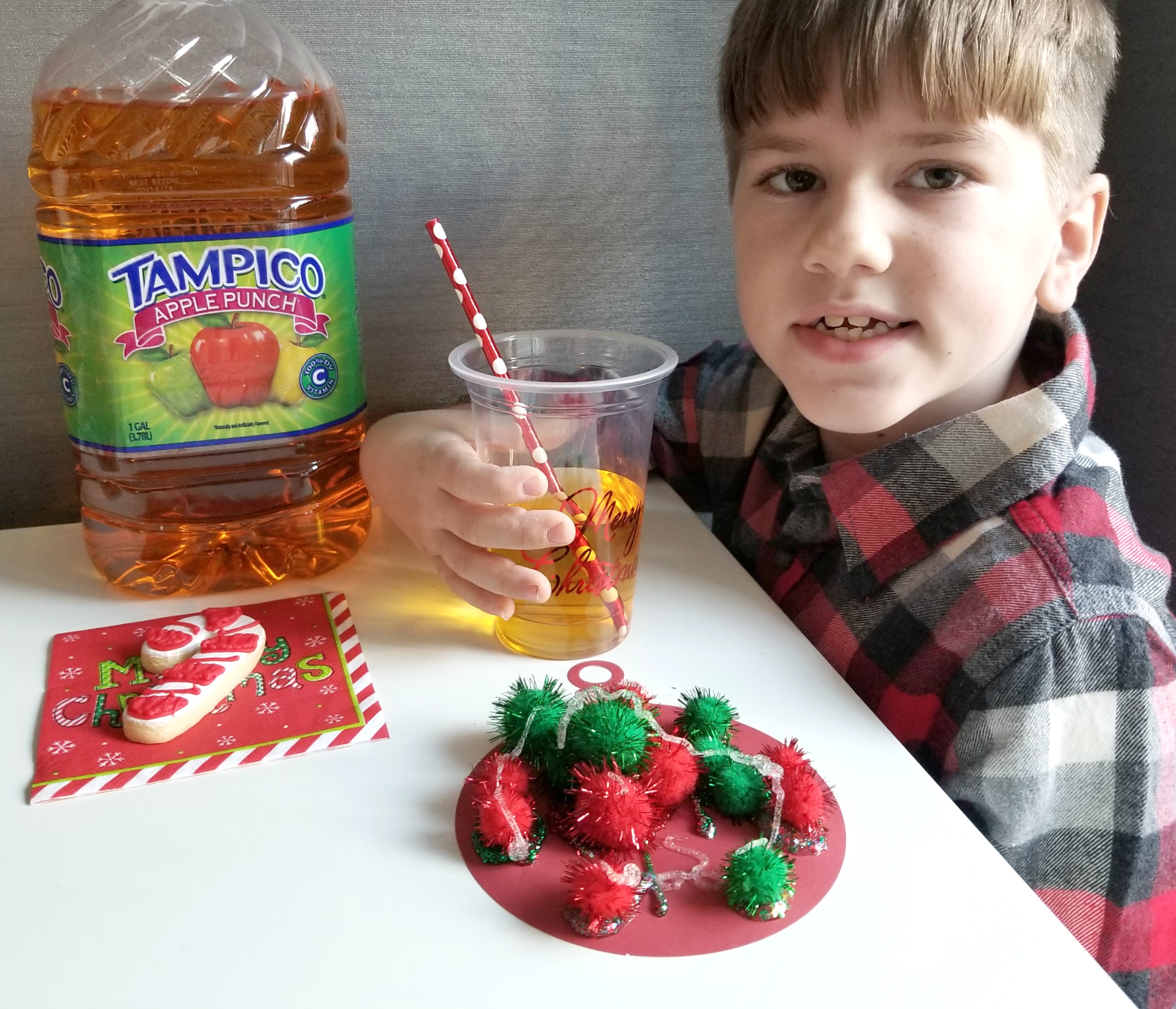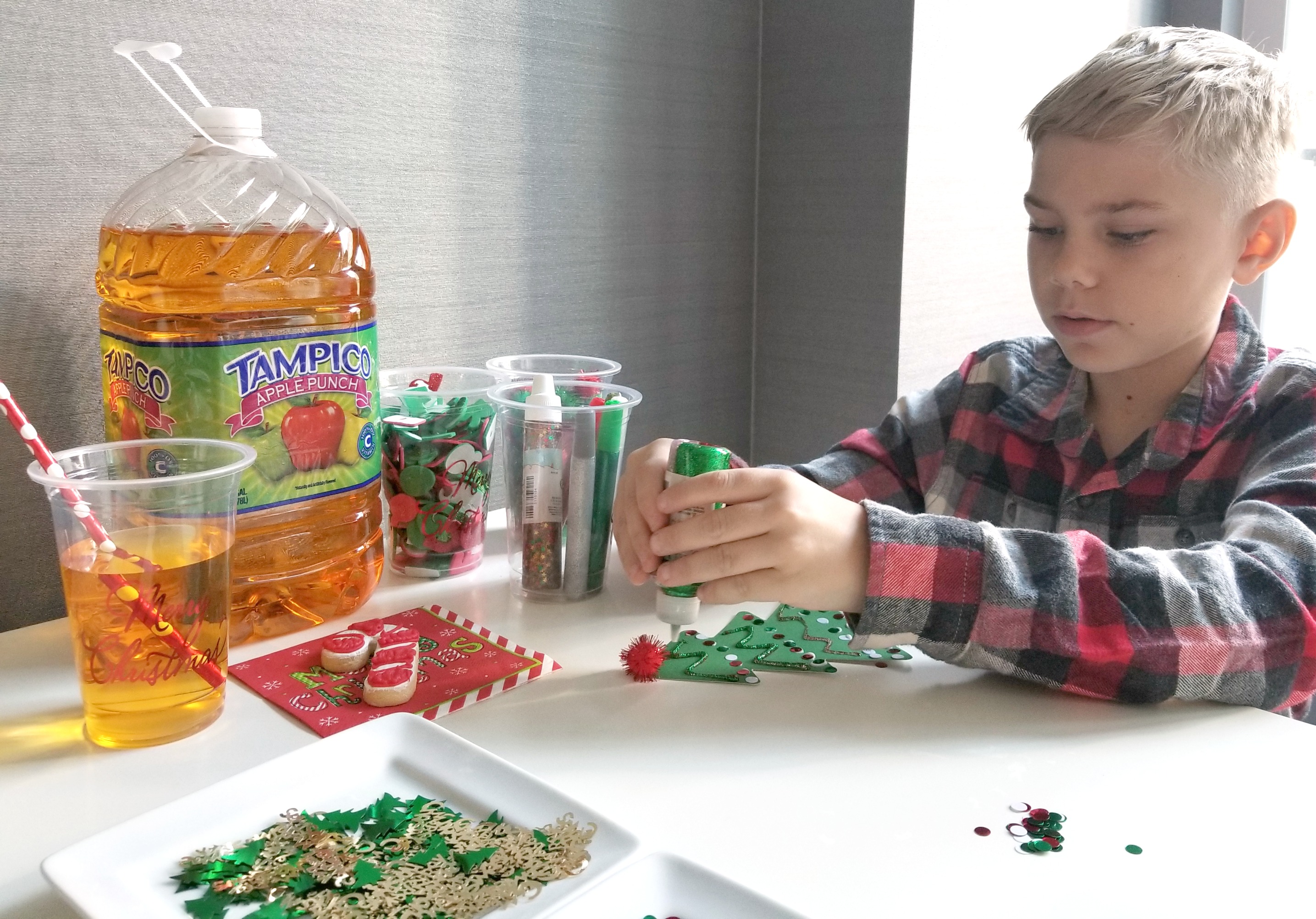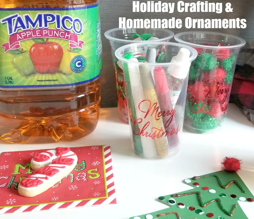 This past weekend I gathered everything we’d need to make ornaments. I found some tree shapes and round ornament shapes to decorate along with sparkly pompoms, sequins, red and green colored letters and holiday glitter glue. To get us in the holiday mood I also found some holiday cups with red straws and Christmas napkins and set out a snack of holiday cookies and of course our favorite Tampico Apple Punch! The perfect set-up to keep any family fueled for the crafting session.