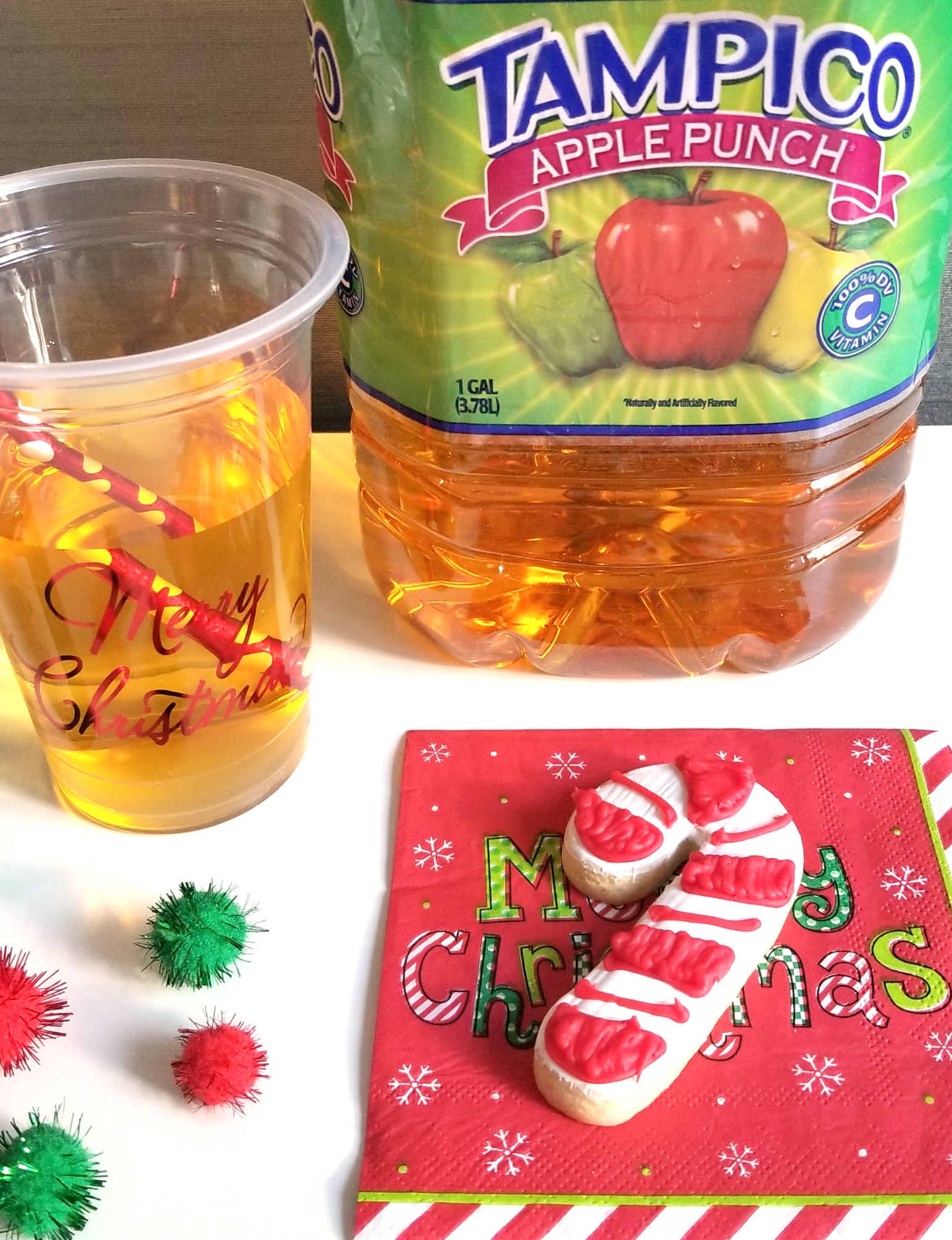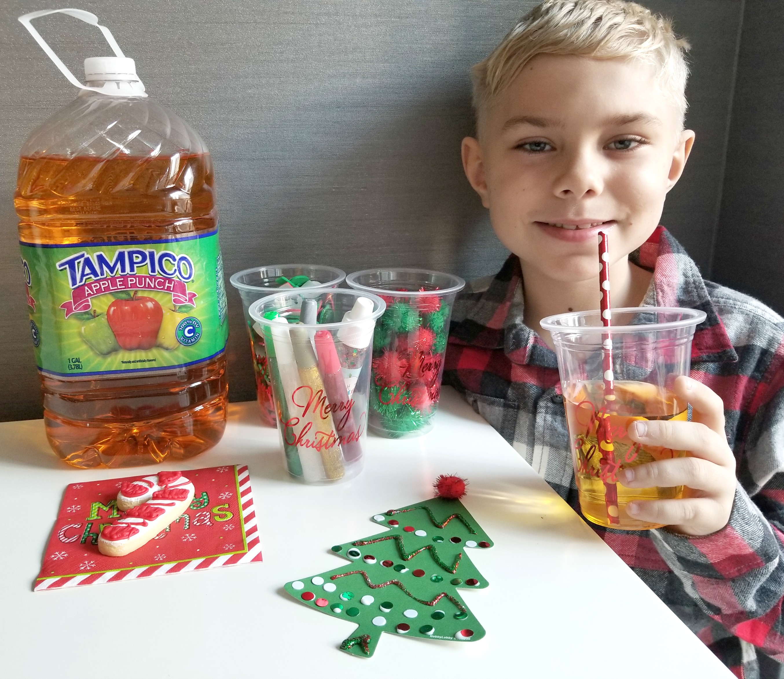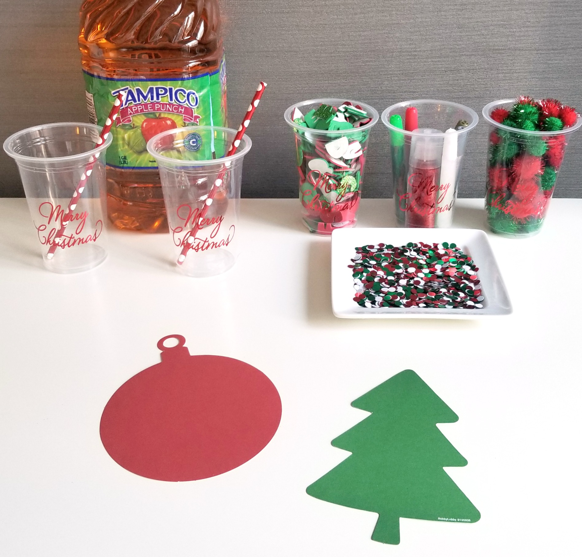 This past weekend I gathered everything we’d need to make ornaments. I found some tree shapes and round ornament shapes to decorate along with sparkly pompoms, sequins, red and green colored letters and holiday glitter glue. To get us in the holiday mood I also found some holiday cups with red straws and Christmas napkins and set out a snack of holiday cookies and of course our favorite Tampico Apple Punch! The perfect set-up to keep any family fueled for the crafting session.
