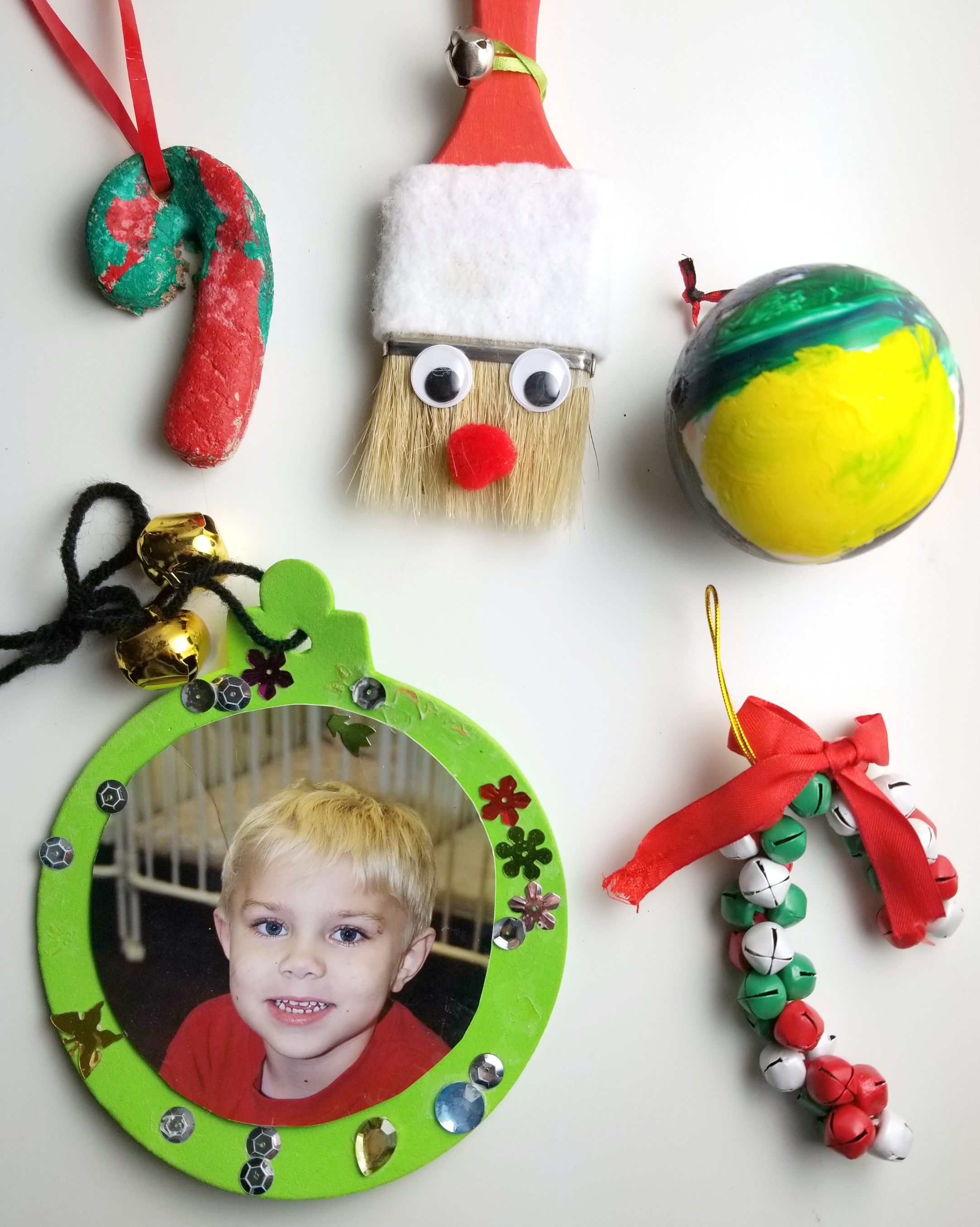 Our tree is loaded with ornaments, from apple ornaments gifted to me when I was a teacher to our yearly family personalized dough ornaments to ornaments I was given as a child. The homemade ornaments stand out most of all though. There are colorful painted ornaments, jingle bells formed into candy cane shapes, and pictures of my children’s faces surrounded by carefully placed sequins. It’s fun to look back on the ornaments my boys have made in past years.