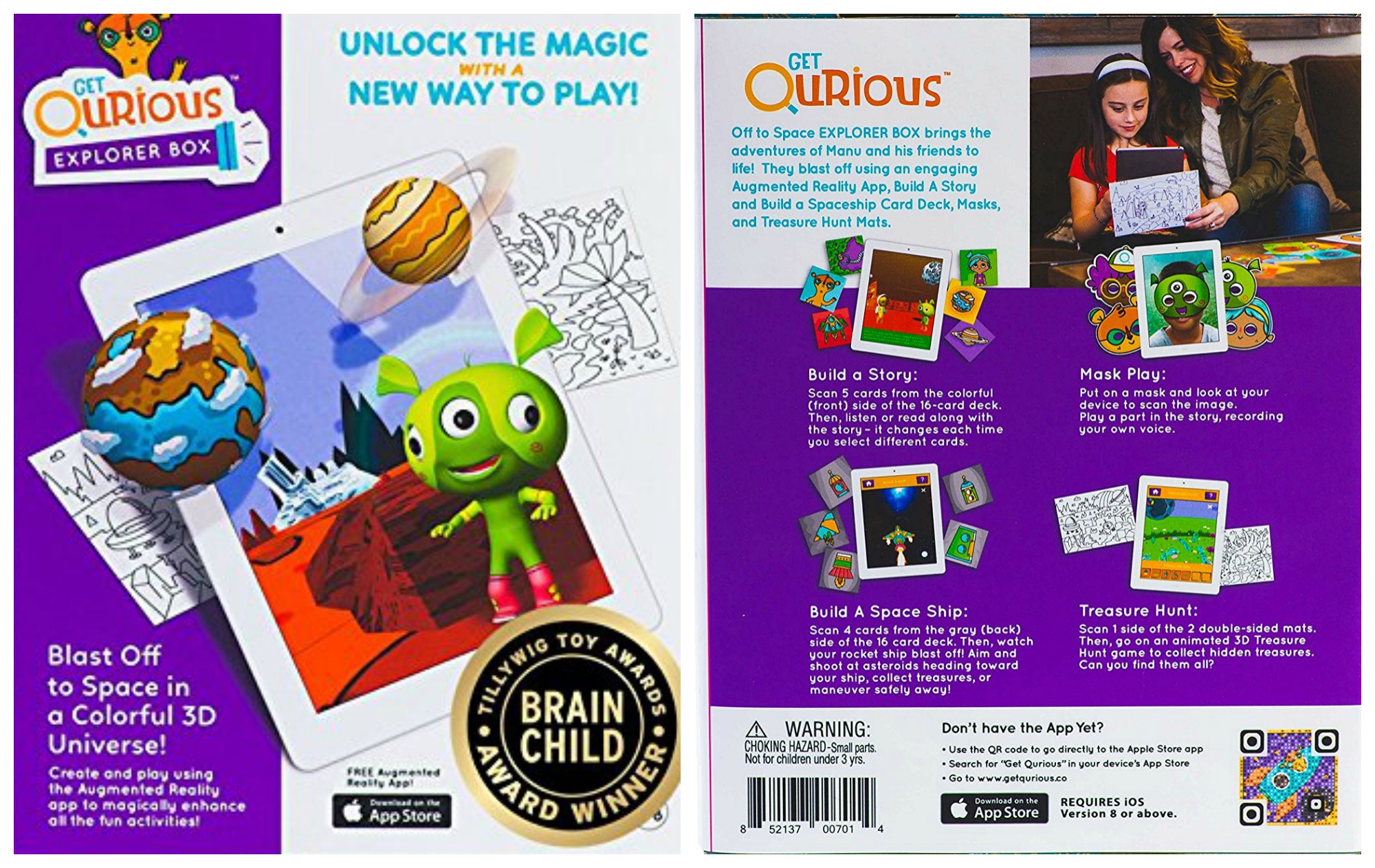 With GET QURIOUS, children engage in creative play with story cards, sticker books, puzzles, masks, and more. Their play experiences can then be enhanced by playing with the Augmented Reality apps. Once downloaded, the apps bring endless game and activity variations to the children’s play experiences while fostering their curiosity, discovery, and passion for STREAM – Science, Technology, Reading, Engineering, Art, and Math. Kids can enjoy these activities by themselves, or with others. Different boxes are available. The GET QURIOUS EXPLORER BOX and Augmented Reality app bring the adventures of Manu & his friends – Leo and Emma – to life as they blast off into space together. The fun experience of combining physical game pieces with an interactive world encourages curiosity and imaginative play. The EXPLORER BOX helps you create your own stories, build different spaceships and maneuver them within 3D space animations, record stories with four masks of your GET QURIOUS friends, and discover hidden artifacts in four brilliant 3D animated space worlds.